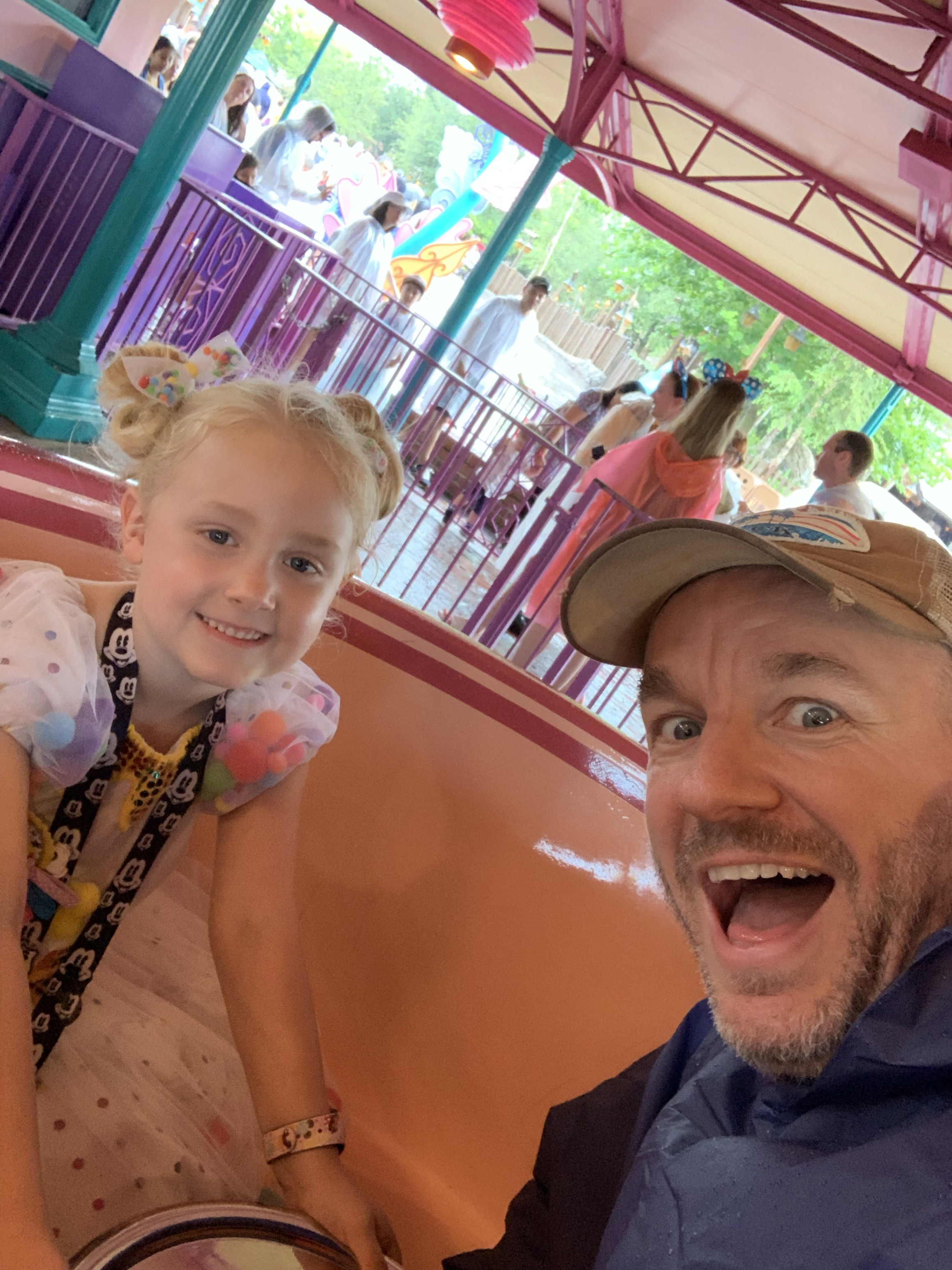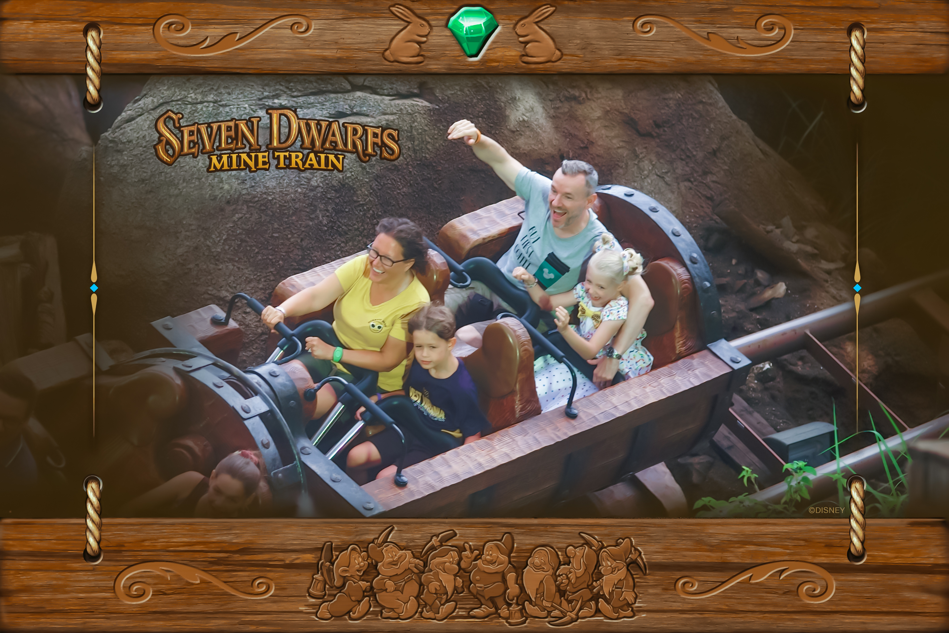 We had an 8.20am breakfast for Be Our Guest which I modified to 8am last night. Now I know lots of you love BOG breakfast and lunch, and there’s no denying that it is very good value on the dining plan as it costs a lot if paying out of pocket, but I never found the breakfast food to be anything special. I’m not a big breakfast lover though, and our main reason for the early meal wasn’t actually the food. It was to get a head start on the rope drop for 7 Dwarves Mine Train. Basically, once you’ve eaten (I advise pre-ordering), so long as it’s neither an EMH or special event morning, you can go and get in the queue for the ride before regular guests are even allowed onto that part of the park. Definitely a good plan if you can’t get a FP/ want an extra FP. You can pretty much always snag a pre park dining slot close to the day as people always cancel (I booked two last trip whilst we were on the bus heading there!) and you don’t need to order full meals for everyone, so it can be a really good plan. We were sat down at Be Our Guest by 8.15, had finished eating by 8.45 (I can’t remember what everyone had other than Steve who had a Croque Madame as well as the girls’ eggs they didn’t want before declaring that instead of Disney bounding, he’d be egg bounding! Always the guarantee of a good dad joke when Daddy P is in town!)  and headed straight to the 7DMT queue and were off the ride by 9.10am, and as a bonus Winnie got to ride the front and Polly the back, which is what they wanted.
