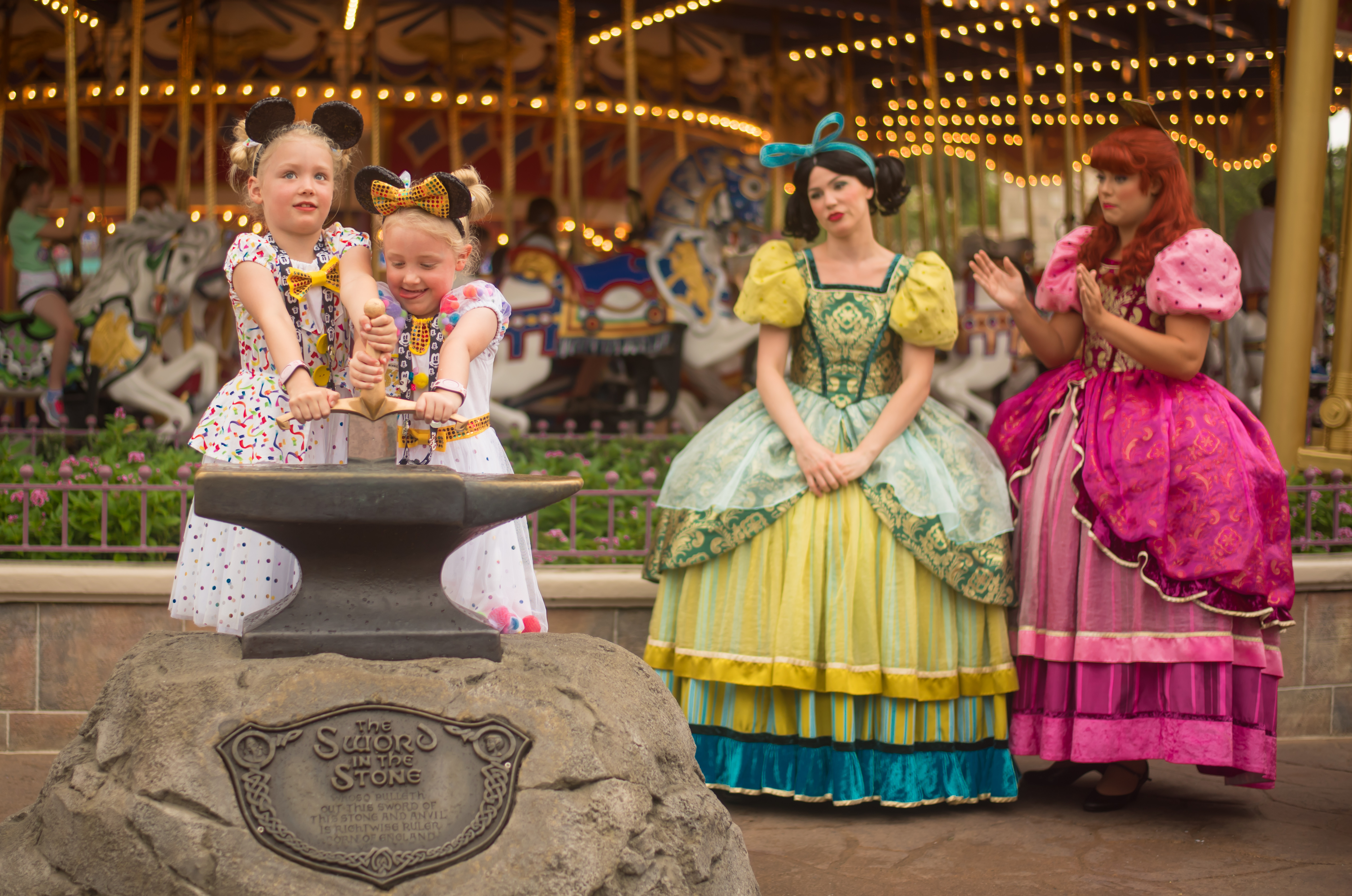 Following 7DMT we headed for the carousel (because what other ride would you choose when the park is practically empty with no queues for any of the big rides?!) I hate spinny rides but decided to brave it, and just about coped. Afterwards the girls wanted to try and pull the sword out of the stone. This is just outside the carousel and always fun (especially when they don’t have a clue that it is stuck there unless someone presses a magic button!) While they were trying the stepsisters walked past and started cheering them on, which they loved!