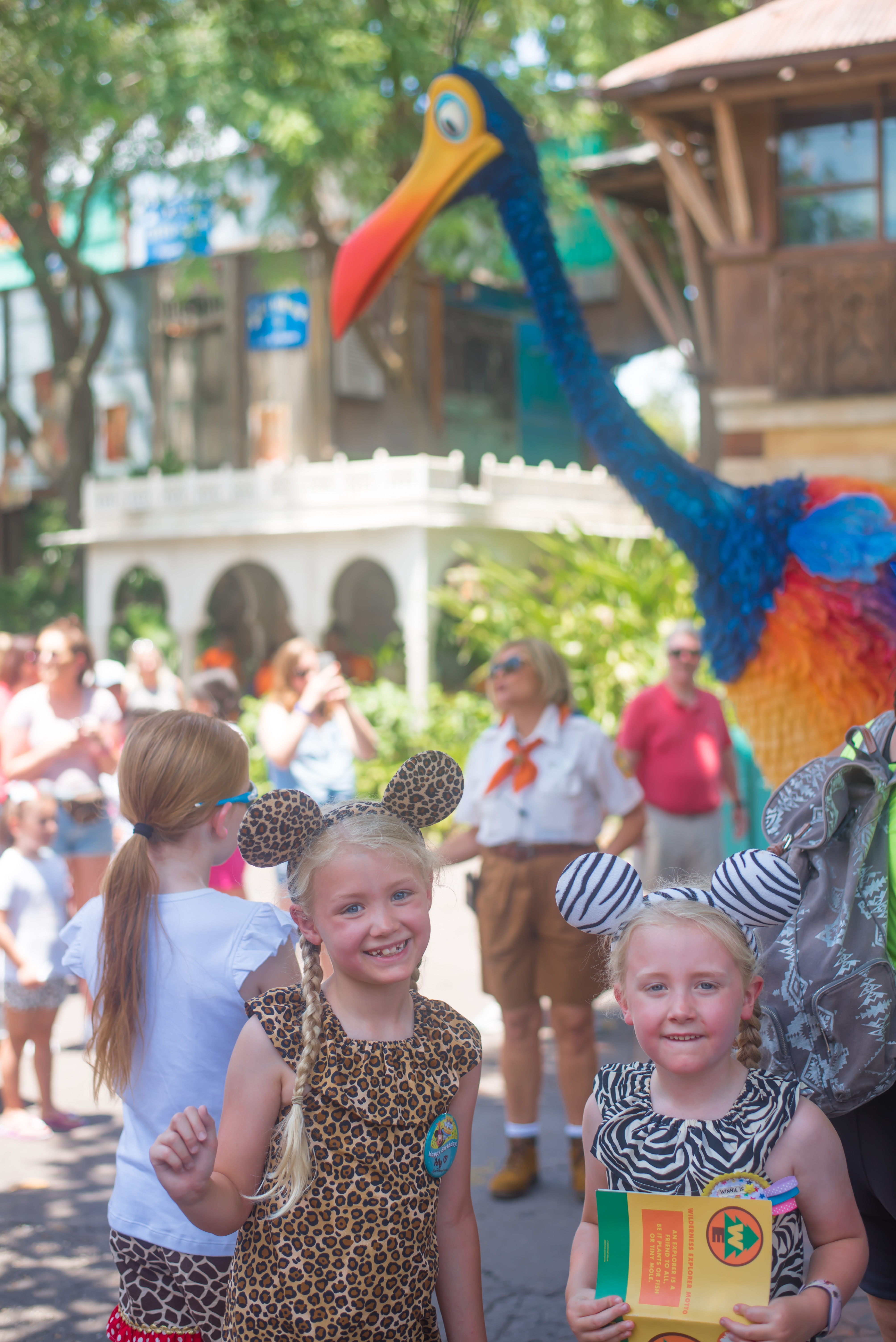 After lunch we headed back to Animal Kingdom. This is our 3rd visit in a week, but it is such a big place that in this heat we decided to break it into sections and take a different area each time to make it more manageable/ enjoyable for us all (especially the small person with the little legs who likes to moan how tired they are. And no, I’m not talking about Steve although you could be forgiven for thinking that!!) We were the only people on the bus (which led Winnie to declare ‘this is the life!) and the temperature didn’t seem as bad as our last visit upon arrival. Now Polly decided that today was the day that she was going to bring out the birthday badge (last time we visited on her birthday she said she hated wearing it on any day other than her birthday as she said she felt like she was lying when people wished her happy birthday! Bless her heart!) but we couldn’t find it in the rush to leave, so I headed straight to Guest Services to pick a new one up. I think she quite liked the attention for a bit, but quite quickly asked me to put it in my pocket. She’s definitely her mother’s daughter! We collected a few Wilderness Explorer badges and bumped into Kevin from Up who was really fun for a bird that can’t speak!