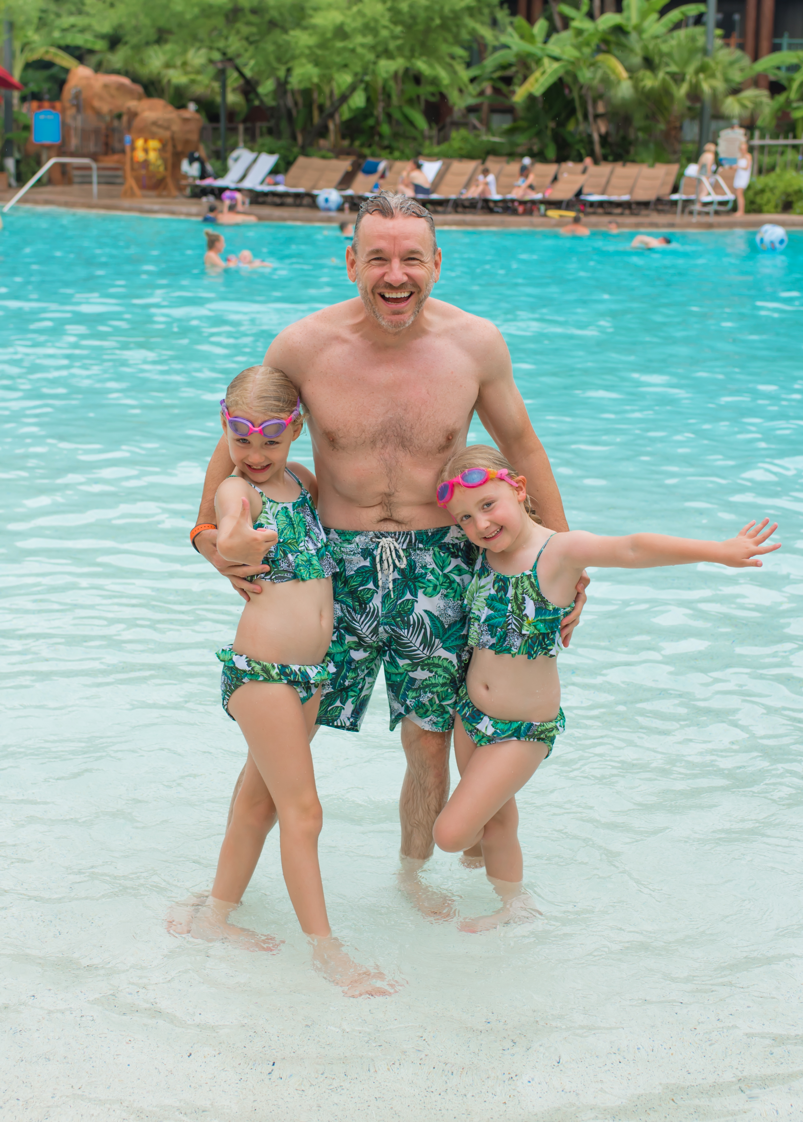 Today has been a much quieter day, which was probably needed after yesterday’s fun filled antics. I woke up at 7am finally feeling more human (I no longer sound like a 90-year-old tobacco chewer not need to carry a spittoon around with me!) and everyone else slept until 8. The girls had muffins and hot chocolate in bed courtesy of Daddy D&P (and the dining plan!) before getting up for a play in the pool (in their matching swimwear!). I attempted to tidy up a bit as the room is starting to feel like it’s closing in (it’s a bit like the genie’s lamp…itty-bitty living space) and I have the girls dresses laid out everywhere in case they want to wear them twice as there’s no way I’m ironing them again. I love Disney hotels but a 12” hanging space for 4 people is never going to work!