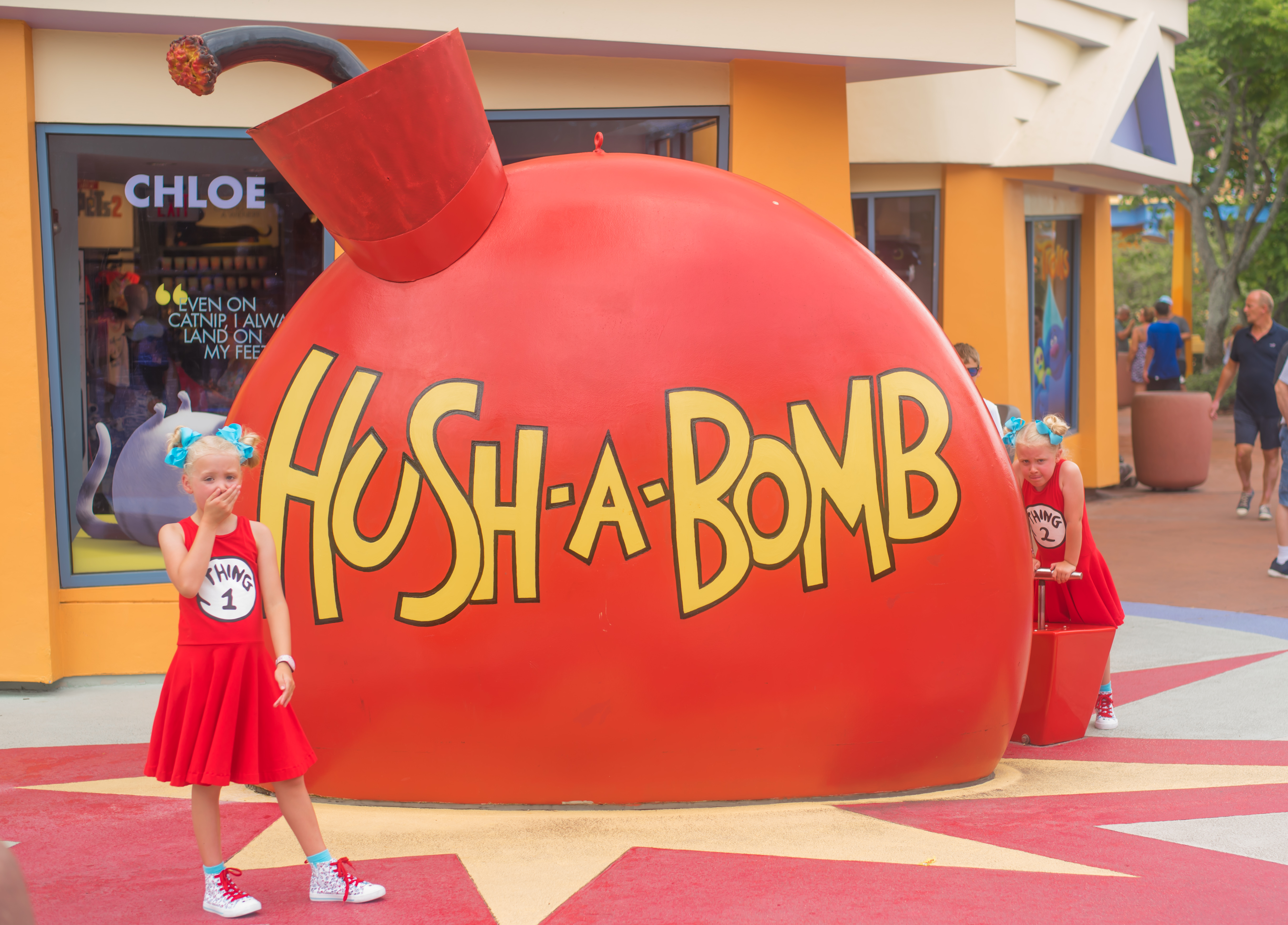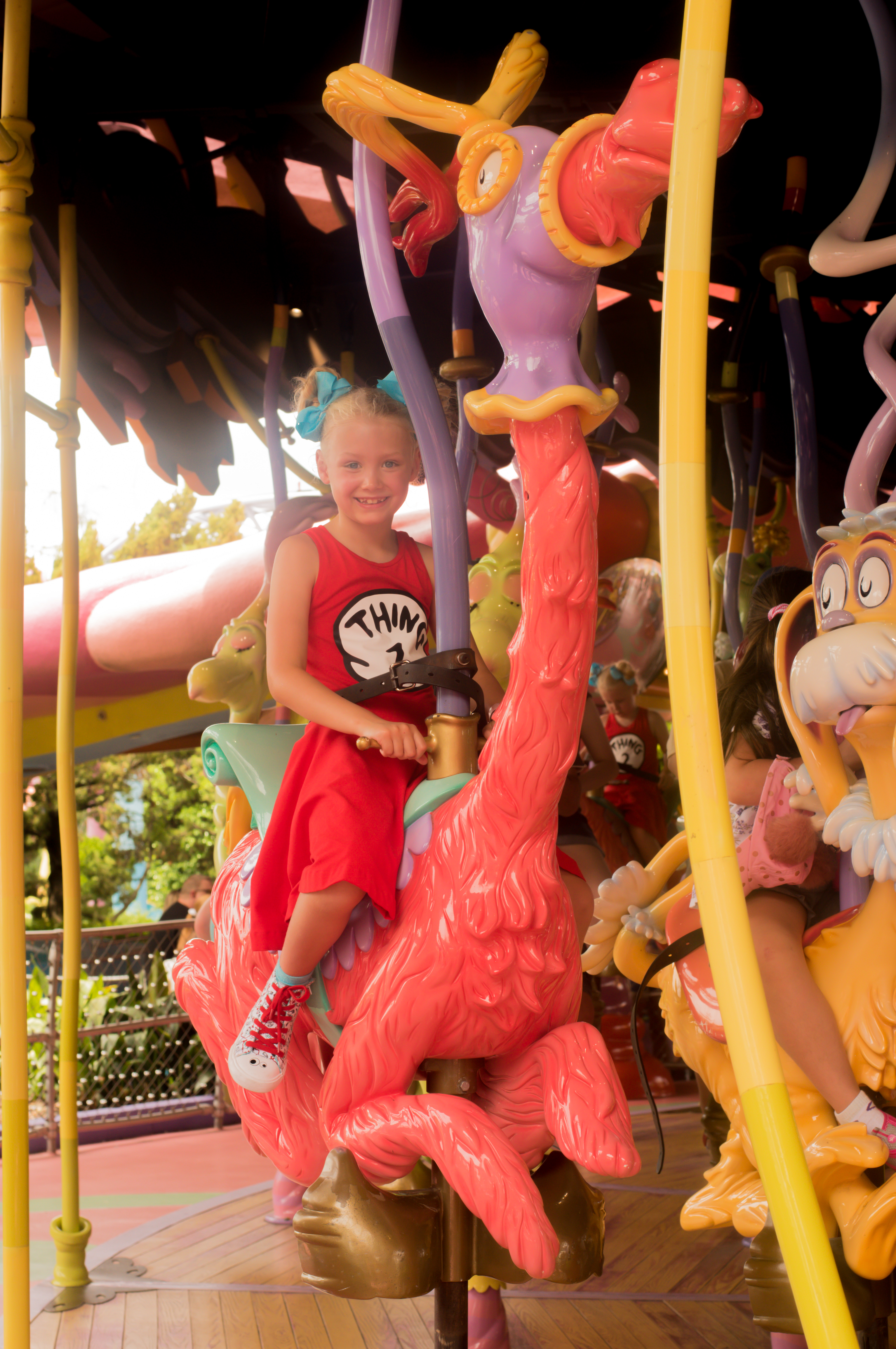 Queues were huge by this point and I honestly think if you are wanting to go on a lot of rides the Express Pass would be a blessing, but as we didn’t, we were fine. We saw a few superheroes and then walked to Seuss Landing. The girls spent forever in the book shop and ended up buying a book each to read by the pool. They then met a few characters including Thing 1 and Thing 2 which wasn’t planned but a nice treat, and then rode the carousel.