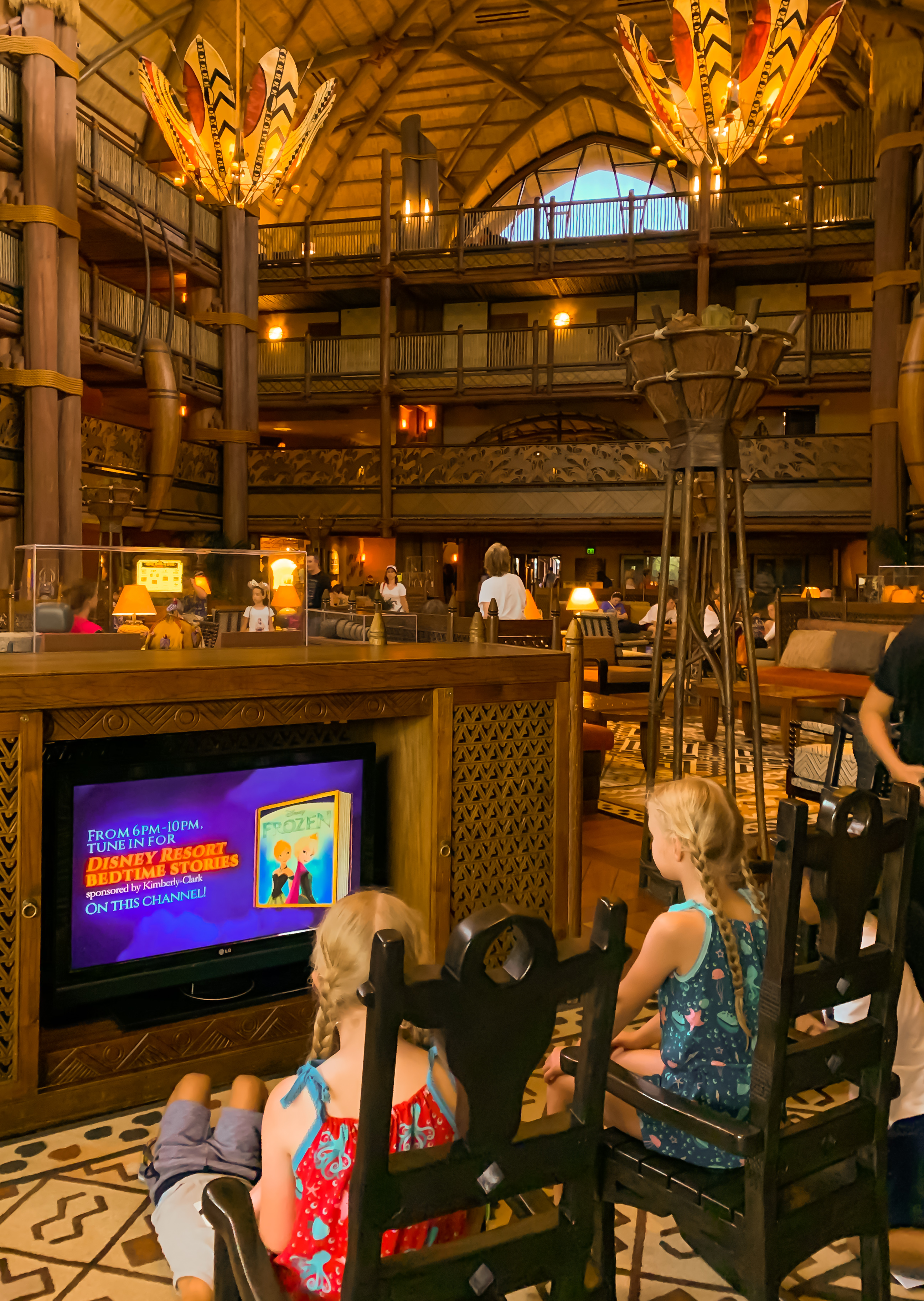We got ready to sit by the pool even though the sky looked ominous, but only managed around 10 minutes before it closed for a humungous storm (we wouldn’t have bothered going out but our room is one of the last in the cleaning cycle and still hadn’t been done so we wanted to be out of it when the housekeepers got there.) The girls were quite happy sitting in the lobby and watching the random Disney programmes they have on the TV there. Mind you, who wouldn’t love sitting in a lobby as beautiful as the one at Animal Kingdom Lodge?