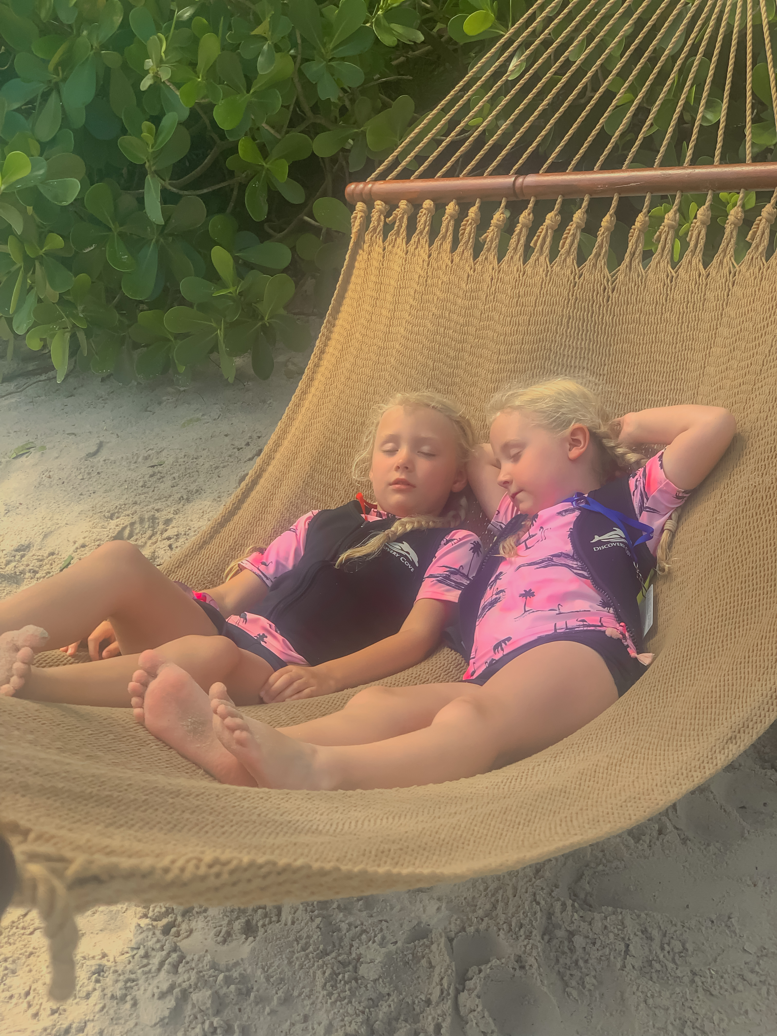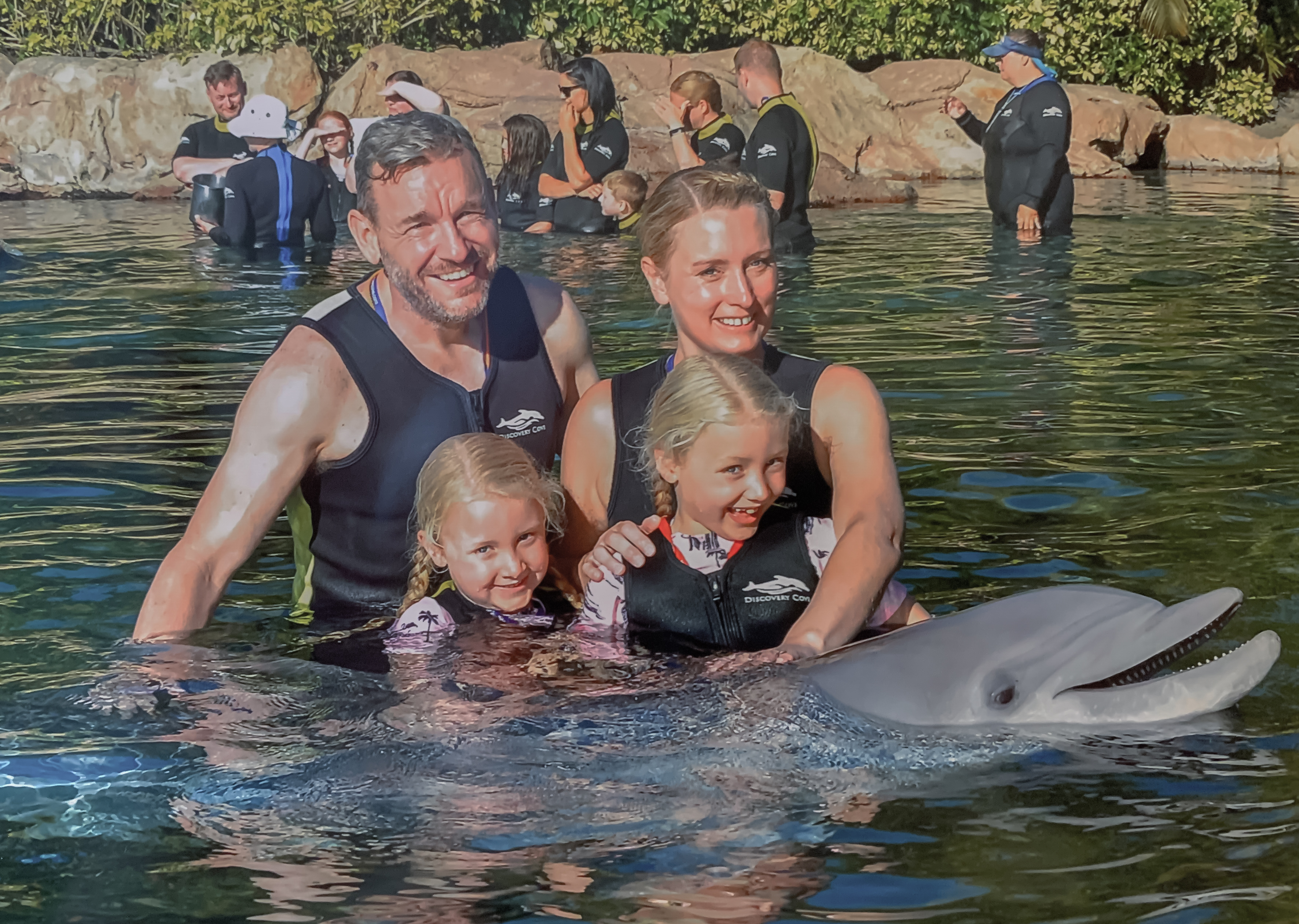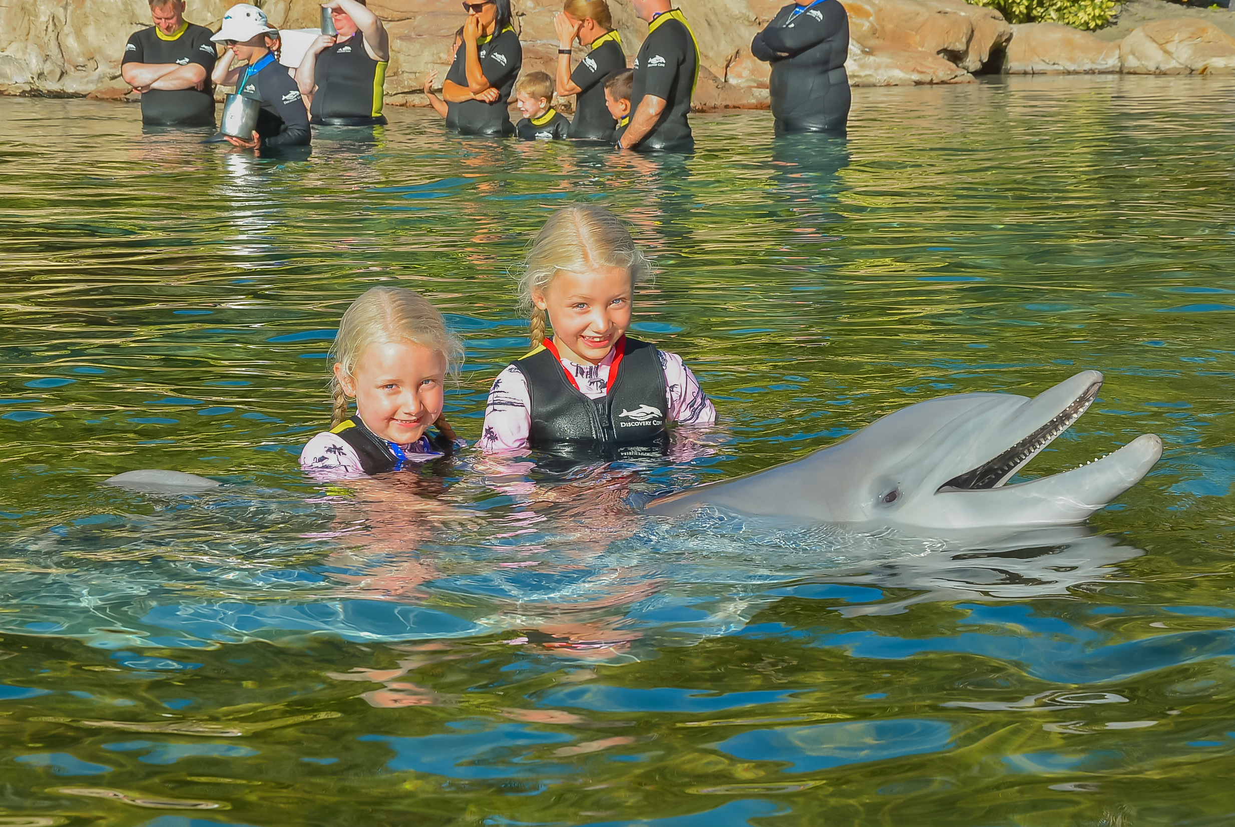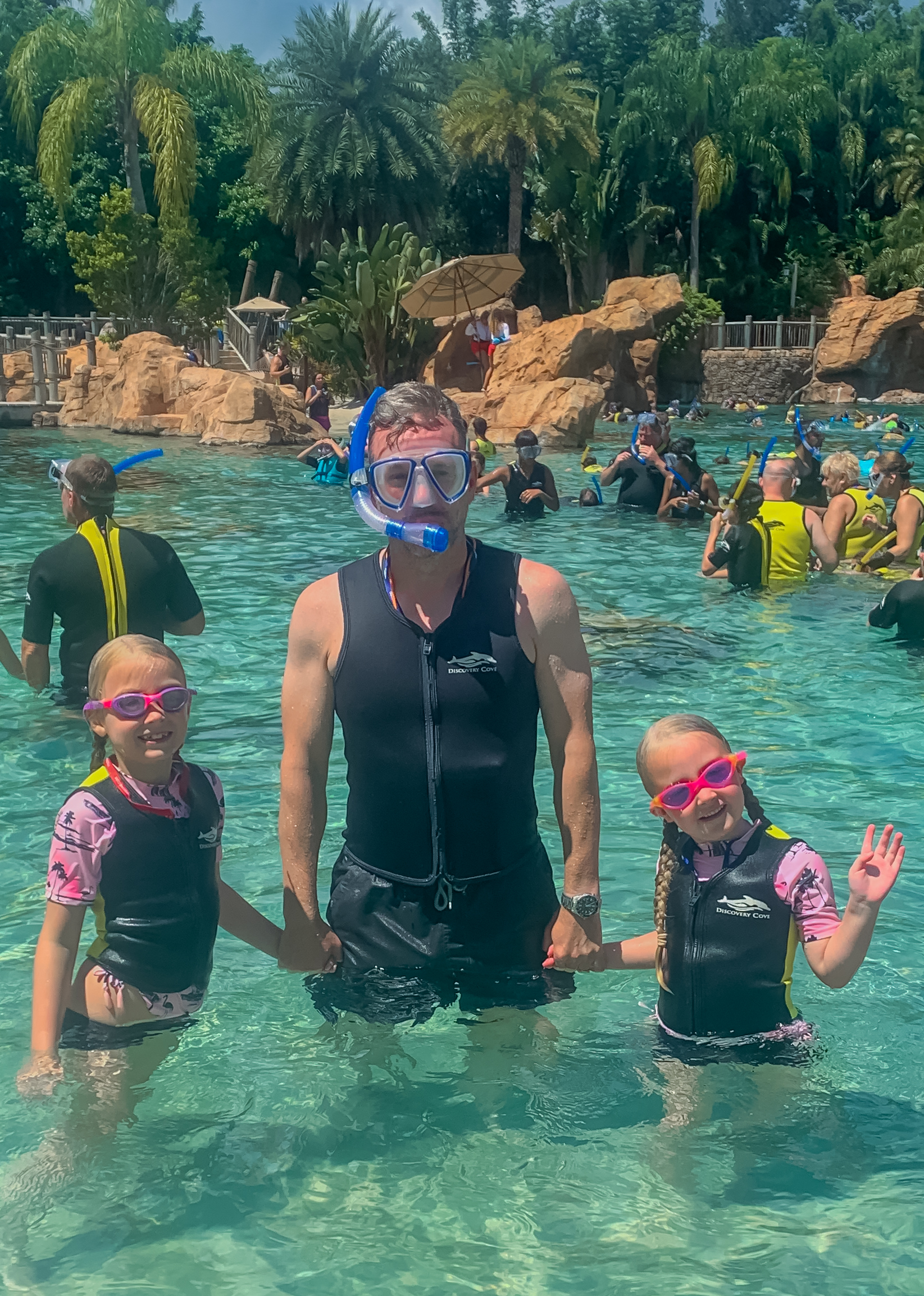 Today was Discovery Cove day. Polly has been asking to do this forever, but we wanted to wait until Winnie was old enough to join in, so this was the year. The girls were very excited and even though it was early were on great form. Winnie said she couldn’t wait to swim with her first favourite sea creature (the second apparently being a jellyfish!) We managed to be up and away by 6.30am and were checked in before 7am for the first swim of the day at 8am. Because we were so early (we weren’t the only crazies there at that time, honestly!) we were advised to grab something to eat before going to get our wetsuits and lockers. We grabbed a light breakfast (a full breakfast doesn’t fill me with happiness at the best of times, and certainly not before water-based antics…plus Winnie thought I’d she ate too much she might make the dolphin sink!) before trying to find the lockers. We asked two people who told us two different places to go. We went with the second suggestion which turned out to be the furthest point possible from our dolphin swim, but never mind. We opted for vests assuming it would warm up later. We had to remove all jewellery which I knew but had forgotten about. Now, my wedding/ engagement rings are quite chunky, and since my beloved placed it gently on my finger 10 years ago my fingers and knuckles have become slightly less elegant and more like gnarled tree trunks!! After a brief panic I realised there was sun cream on tap, and a few squirts later I managed to get them off. We then set off for our swim.