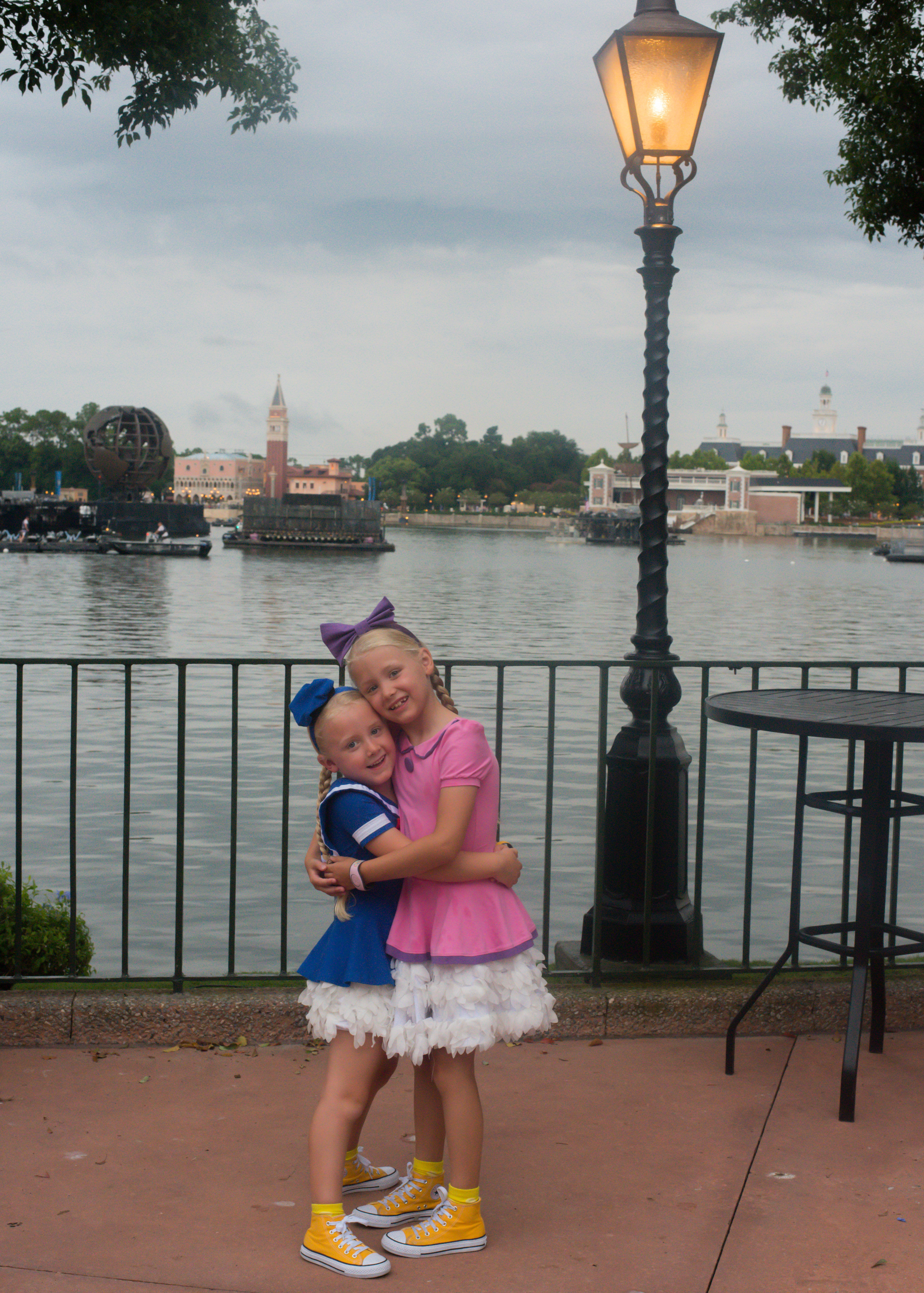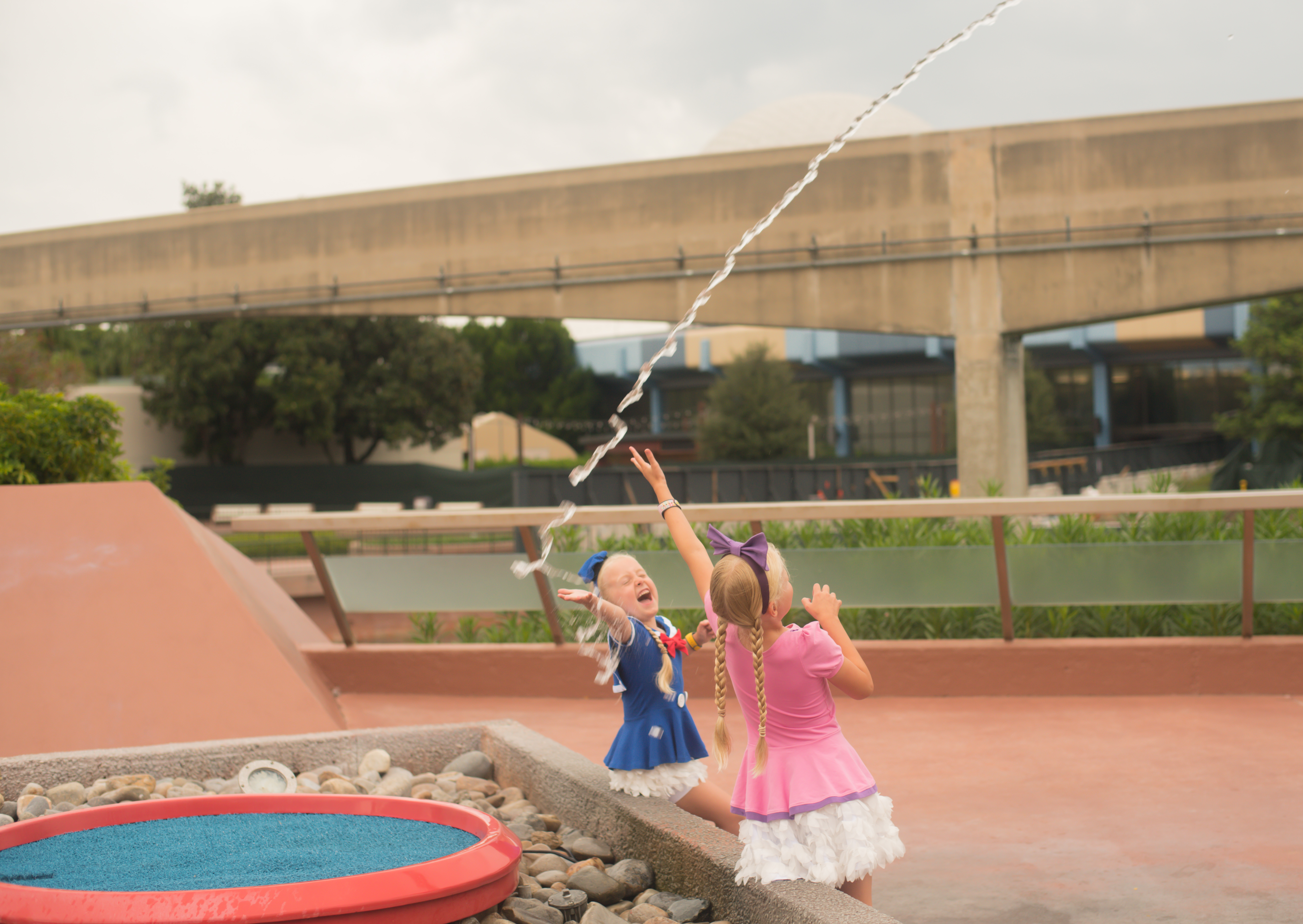 We were going to start with Test Track but when we got there it was down (big shock!) so we all decided we weren’t that bothered and set off for Soarin’. We got the wonky Eiffel Tower seats which the girls found most amusing, but it’s still a lovely ride (we love the smell of the Taj Mahal). We then went to watch the Pixar Shorts one last time as Steve missed out last time, and here some actual real-life Disney magic happened. He stayed awake for the whole show!! The girls genuinely couldn’t believe it. The girls then spent 10 minutes playing with the jumping water. I told them not to get wet as a storm was looming, at which point Steve decided to be clever and guide the water through his arms and promptly got soaked! Mind you, Polly was still drenched from having a drink at the water fountain, so he wasn’t alone.