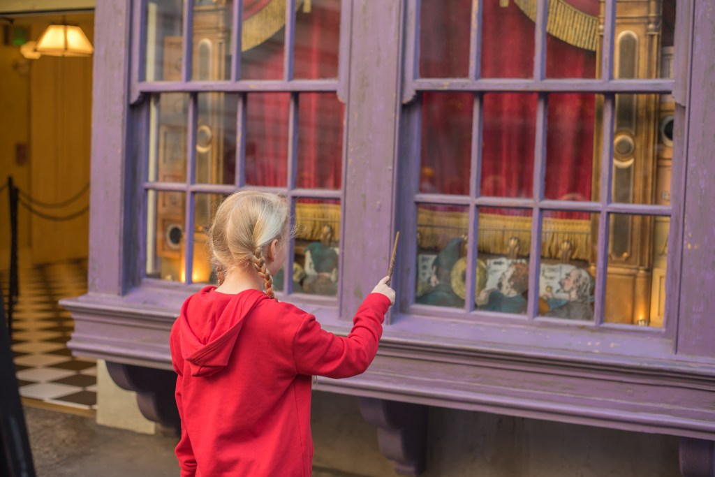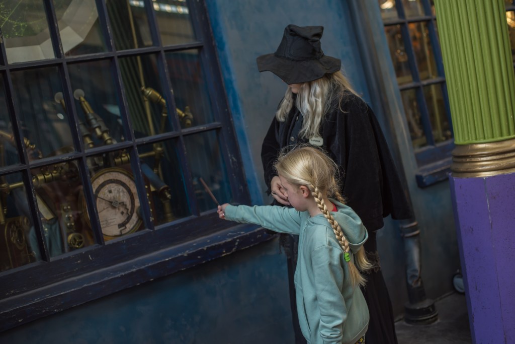 The shop was very busy when we got there but the girls knew exactly what they wanted (Hermione for Polly, Draco for the small one!) so didn’t take us long to get sorted. We then set off to cast some spells around Diagon Alley. Diagon Alley itself is absolutely incredible. The attention to detail is phenomenal and the fire-breathing dragon on top of Gringotts is a must see (and a welcome warm up as it was absolutely freezing first thing!) Scattered around are a series of gold medallions on the floor, each showing a spell and wand-saving instructions for casting it. Each one casts a different spell and they are all a lot of fun. Well, that is if you can get them to work. Our two were less about the wrist action and more about the whole-body dance-move style spell casting, which clearly isn’t the Hogwarts way!! Still, they did eventually get some working and had a great time.