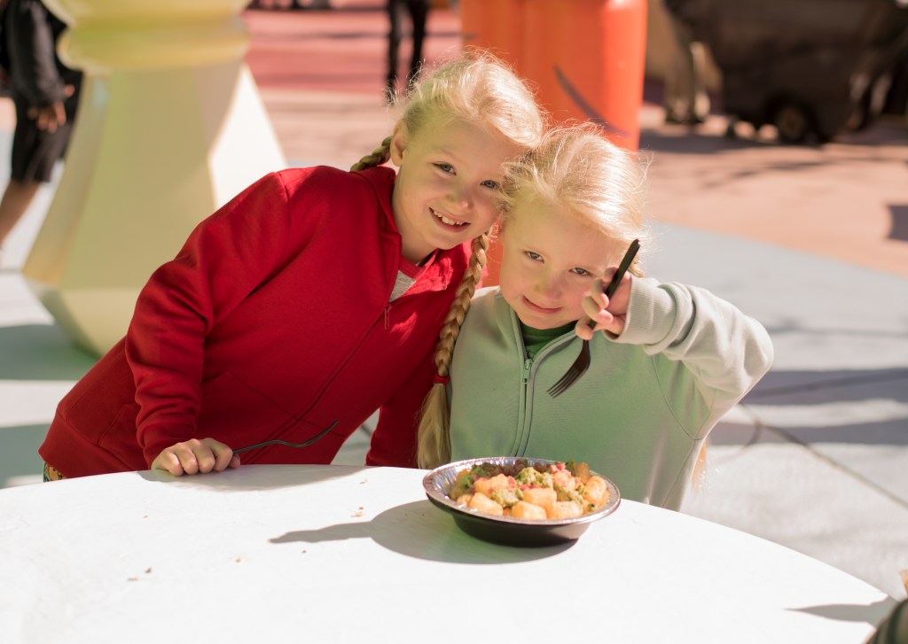 Anyway, quick service grumble aside we had a lovely (if slightly chilly) time wandering into EPcot. Winnie decided ahead really wanted to meet Pooh bear to tell him her name was Winnie too (no idea why she decided that tonight was the night to do it! If I’d had an idea she wanted to do this I’d likely have washed Polly’s face, so it wasn’t covered in chocolate mousse first!! 🤣)