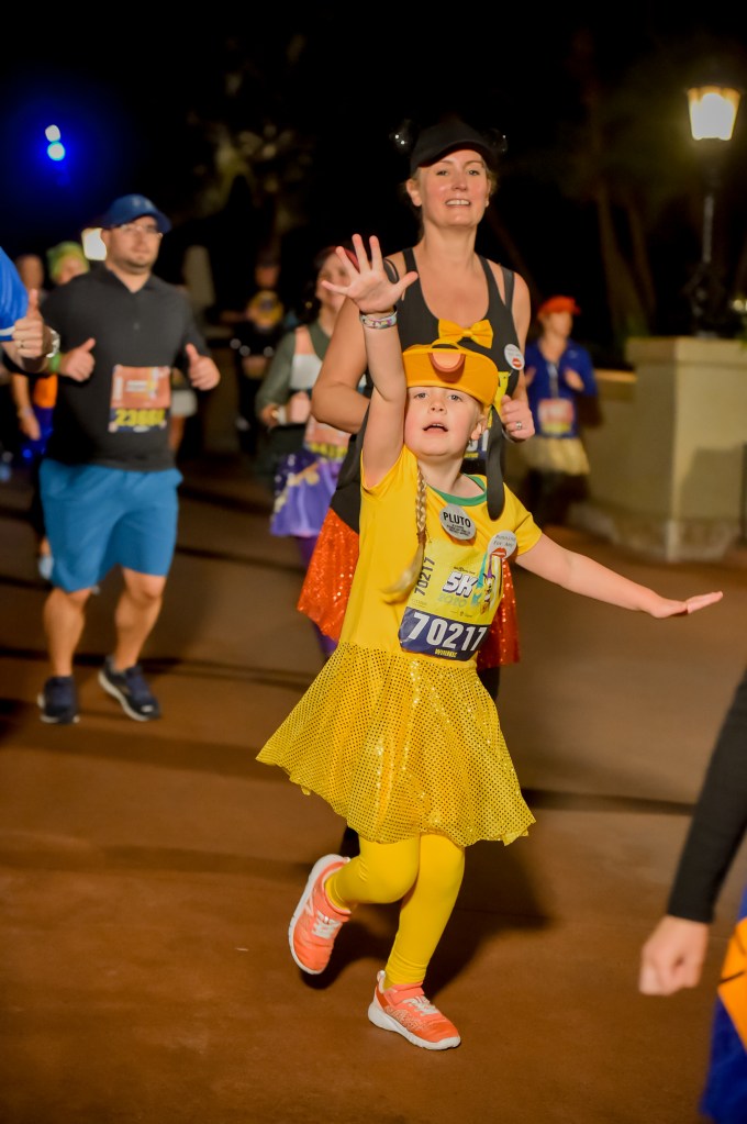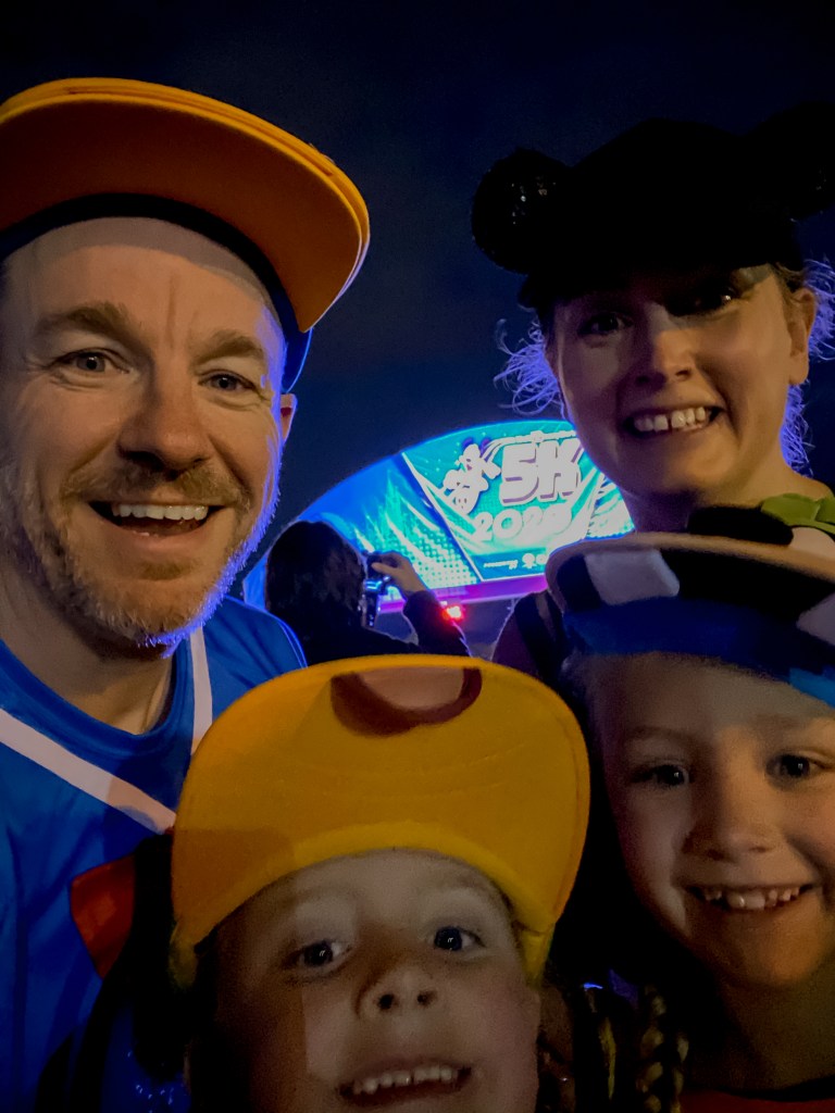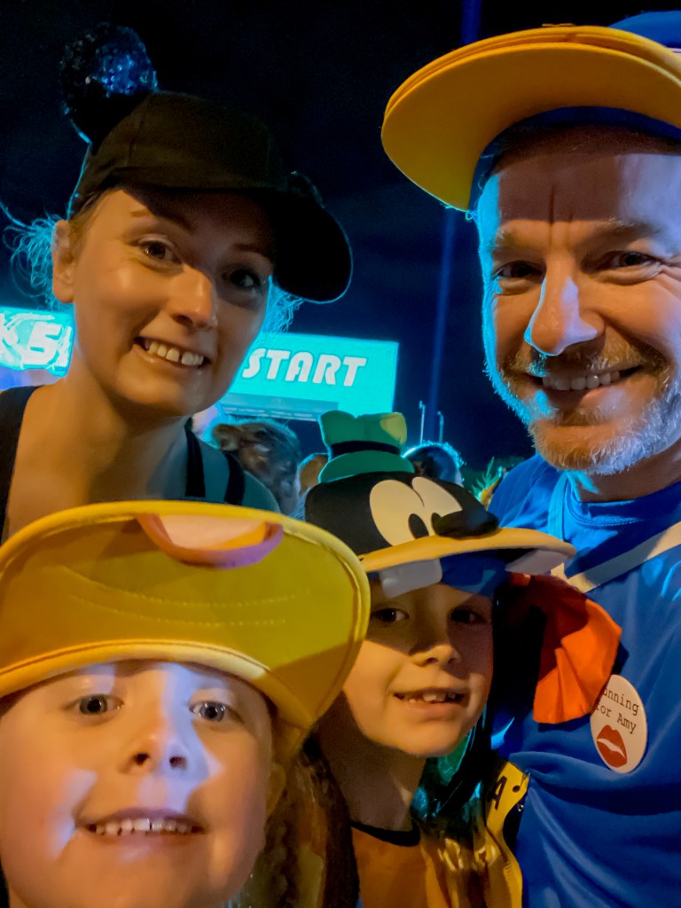 We had to catch a race bus at the convention centre, and we were there by 3.30am but no bus arrived until 4.05am. Still, we managed to get on it and drive into the EPcot parking lot where the race would start. The whole set up is huge. They had stages which were projected on big screens, music playing etc and it really was a party atmosphere. By the time we’d dropped our bag of and been to the toilet (Winnie was not impressed and had to be coaxed to use them!!) it was time to enter our Corral. You don’t submit a time for the 5k which is good, as I’ve never done any running in my life, but somehow we ended up in Corral A which is the very first group. The girls even got to do the countdown for our section of the corral to start as the lady on stage was chatting to them, asking them their age etc. We didn’t go right to the front as left that to the fast runners. I was a bit worried we’d hold people up, but I needn’t have been as so many people just walked the whole way/ ran very slowly. We managed to overtake lots of them!