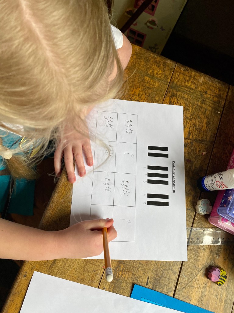 For music, we listened to a selection of Chinese music (thank you Spotify!!) and looked at pentatonic scales and where the notes sit on the stave. We then recapped the work from last week on note length before the girls composed their own pieces and practised them on the piano. This lesson was lovely, and Winnie is still playing her composition now!