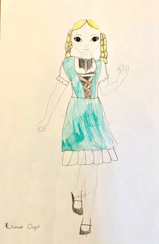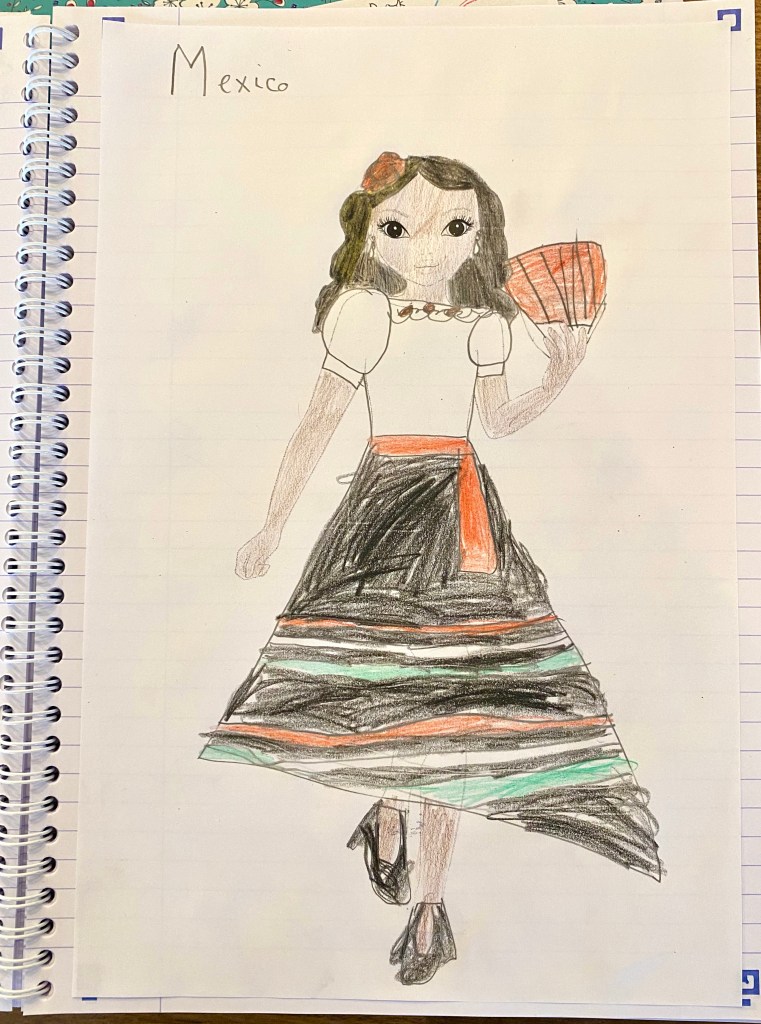 The last topic lesson of the week was to look at and draw traditional costumes. The girls both love costume design and so this was perfect for them. I also bought them sticker books to do whilst we listened to the Circle Round podcasts, which are a selection of stories from Around the World, acted out by professionals. They are lovely!