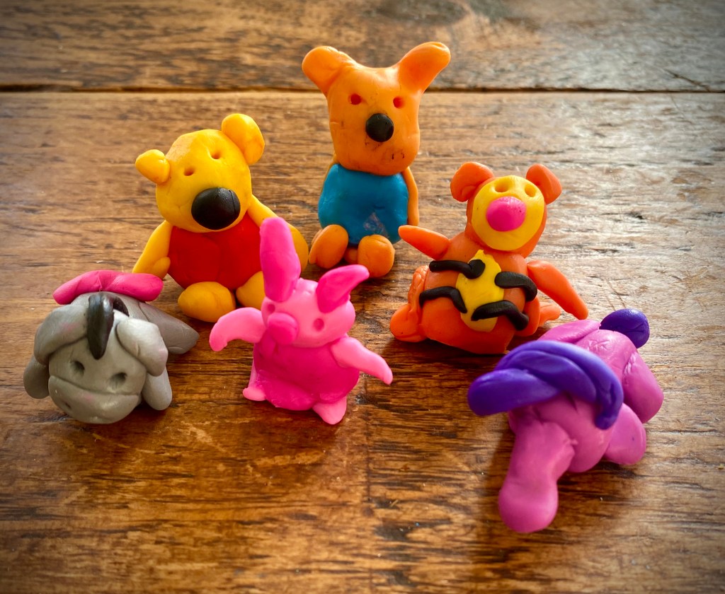We started by coming up with a list of things we needed to create the game (aim, rules, playing pieces, board etc) before the girls decided on how they’d like it to look. They really wanted to make the moving pieces to look like Pooh characters. Luckily, I had some of the bake-in-the-oven coloured clay buried away in the craft cupboard, so they got to work creating. I was so worried that I’d turn them into black ash when I baked them, but they came out brilliantly with all their bits intact!