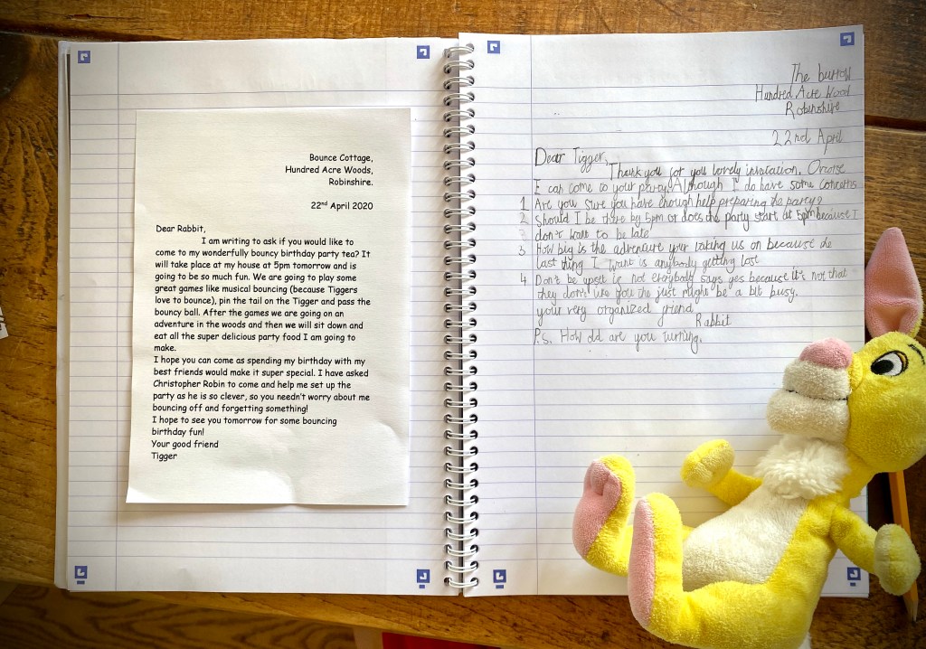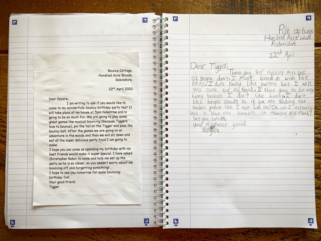 The girls then chose one character and did some drama based hot-seating work, thinking how they would respond to different questions/ situations. They then created a simple character sketch to give them ideas to use the following day when they were each sent an invitation letter to Tigger’s birthday party which they had to reply to in the style of their character. I really love these.
