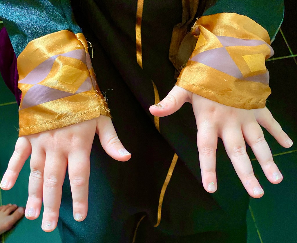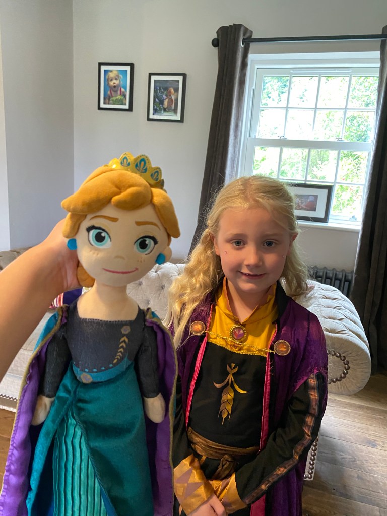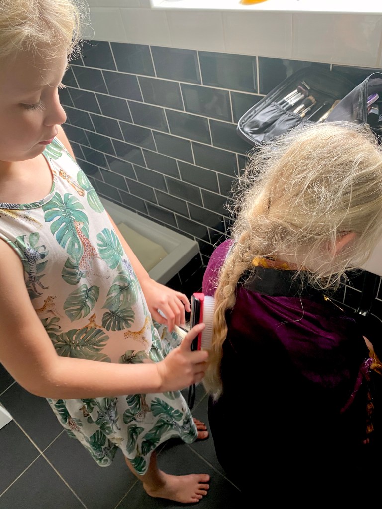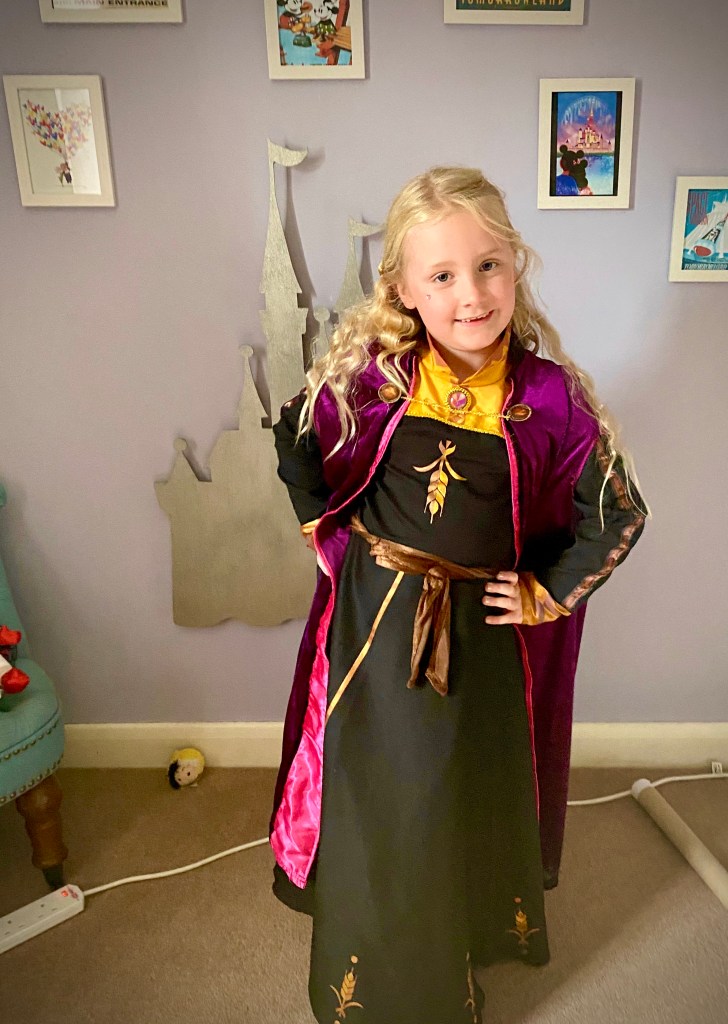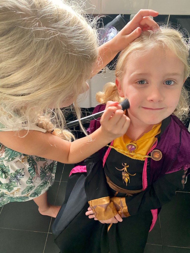 Then it was time for Bibbidi Bobbidi Boutique. The regular salon was closed, and they had moved into the restroom (nothing to do with the fact that mummy had threatened them not to spill make up on the carpet!). Winnie was desperate to be Anna from Frozen 2 as she loves the film (when she’s anxious at night she says she sings ‘When I Am Older’ to herself as Olaf telling her that everything will make sense when she grows up makes her feel calm and happy 😭💕) so Fairy Godmother in Training Polly made it happen.
