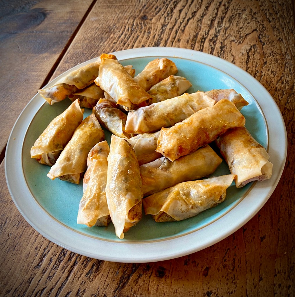 As a savoury option we decided to try cheeseburger spring rolls, as that’s the only savoury thing I’ve ever had at a dessert party. Steve set off to hunt for the wrappers (thank you lovely local Chinese supermarket) before work so we could try them out. I winged it and fried some onion and seasoned mince until the mince was browned within an inch of its life, then added some ketchup. I then put a spoonful in a corner of the wrapper along with some cubes of cheese and bacon pieces and rolled, sealing with egg wash. They were actually really good, so much so that Steve polished off 8!