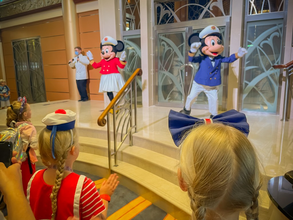 As you enter the ship they announce you by name and the crew clap you onboard. You then stand on your allocated spot to watch Mickey and Minnie do a little dance which is very cute.