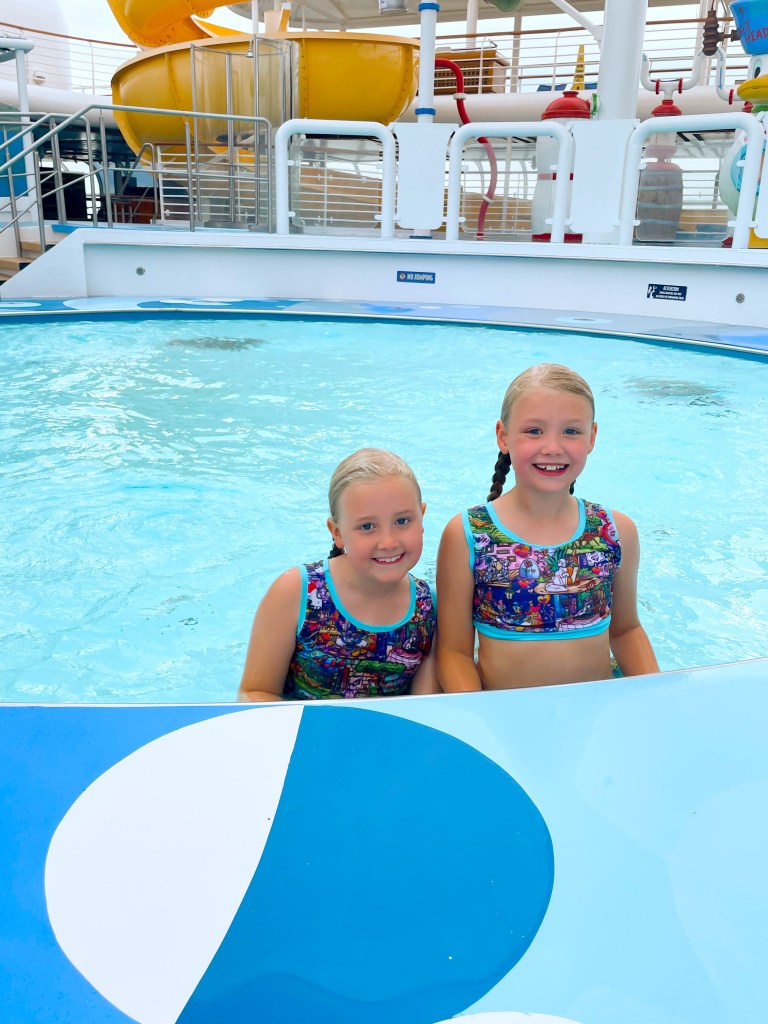 We were then directed into a lounge where we were shown how to access the app which shows all the activities/ meals/ shows/ characters that are taking place. You have to check in at your lifeboat station and scan it on your app, and then you are free to roam the ship at your leisure. Although we could have gone for a sit down lunch at this point, we decided to head straight for the pool before it got busy. This was a really good call as they literally had the water to themselves. Polly went on the Aquadunk (a water slide where you start off at the top in a capsule before the floor drops away and you slide down). She went on it twice which we were so surprised about as she isn’t the bravest. It turns oout she didn’t like it the first time but wanted to go on it again to double check! Winnie made it into the capsule before backing out!! They did go on the other water slide though which they loved.