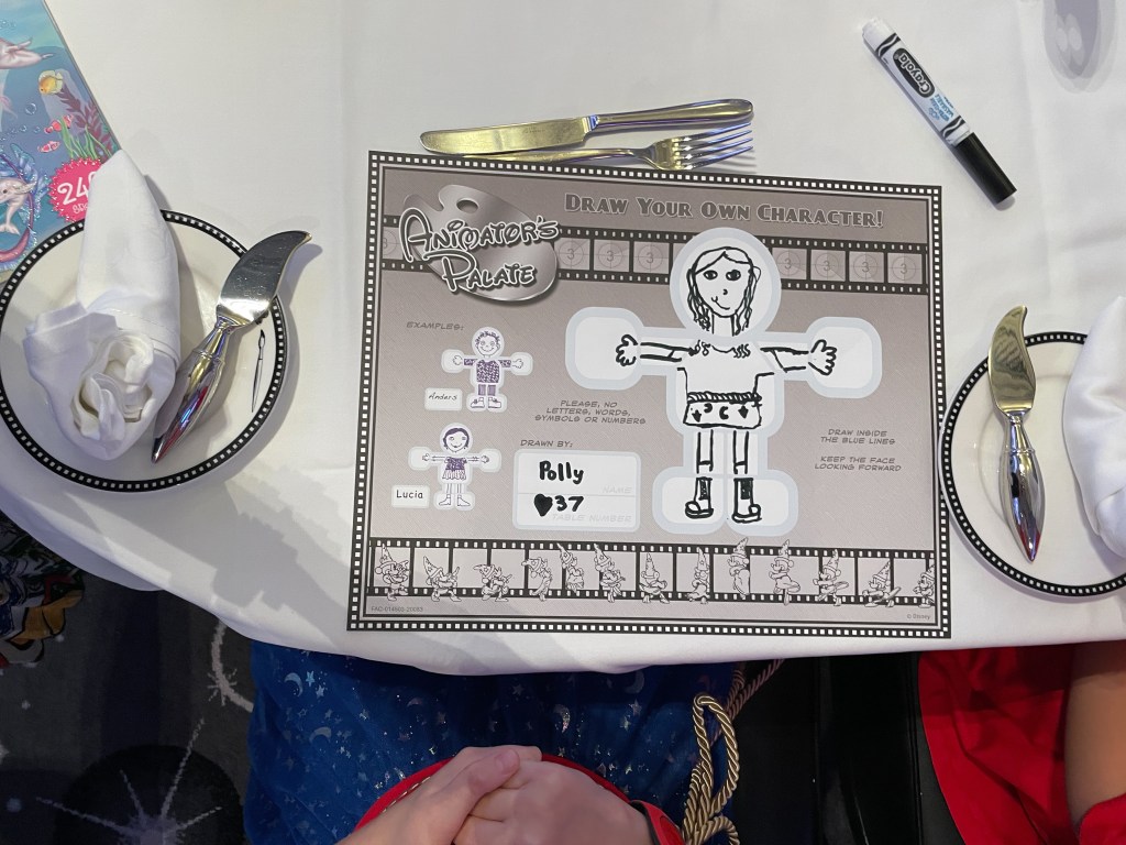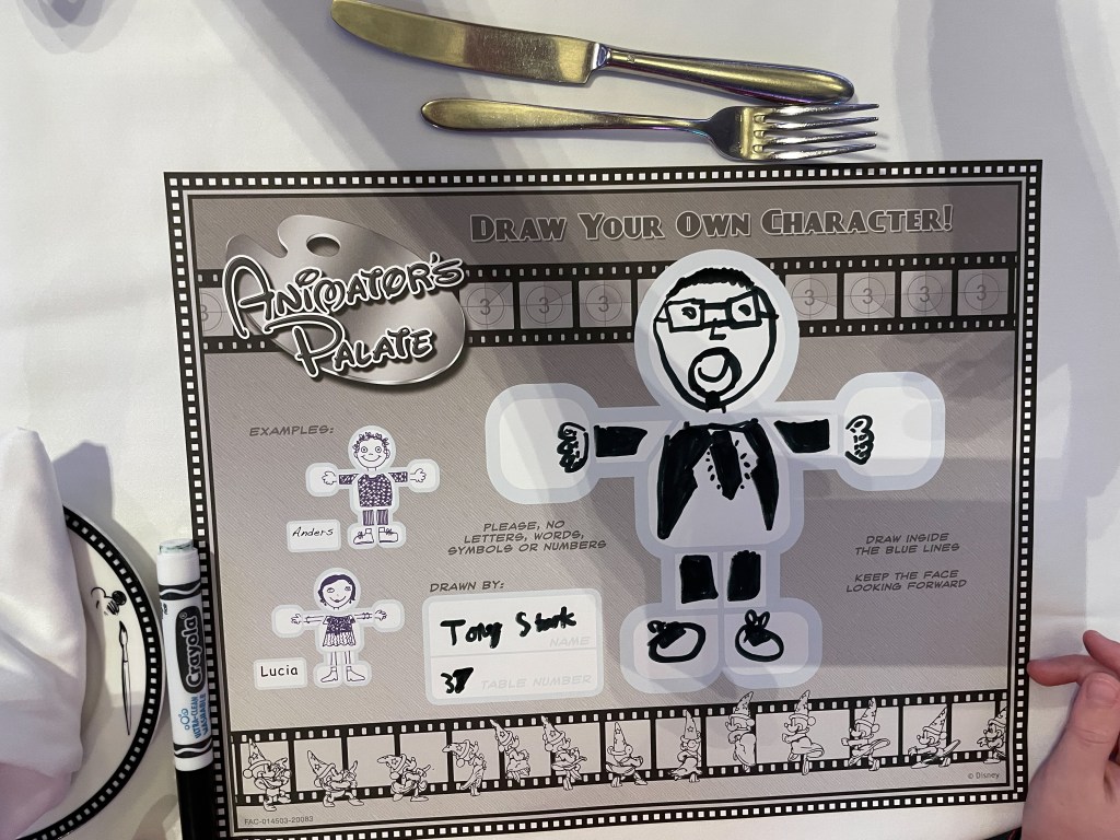 Screens all around the room play Disney clips and when you sit down you have a pen and paper to draw your own character on and write your name. During the meal these characters are bought to life on the screen in a mini animation. It’s fabulous to watch. At the end your names all scroll up like end credits on the film. It was only then that we realised Winnie had written Tony Stark as she thought she was naming the character not putting her own name. It made us giggle.