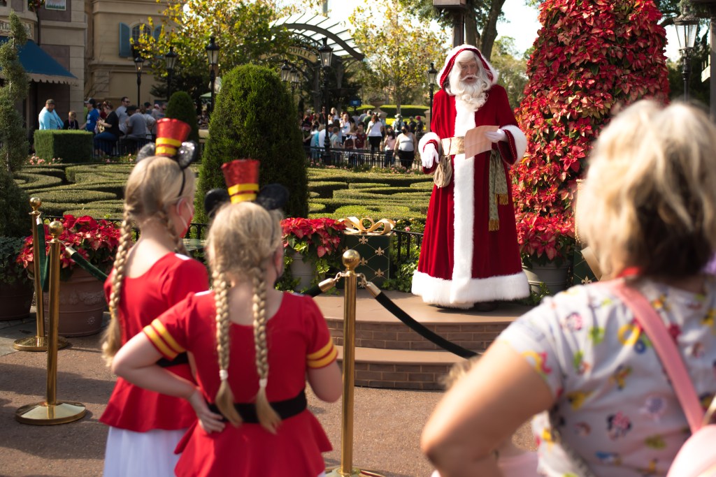 Still, we decided to go ahead and start the cookie stroll (you basically get a card to stamp at set locations around the world when you buy a Christmas cookie there, and the last cookie is free) bribing Steve with the offer of each time the girls had a cookie, he could have a beer. We only made it as far as 3 cookies in (much to his disappointment!) before the heat became too much, so after a quick story from Papa Noel in France we decided to head over to Magic Kingdom so we could cool down on the monorail and come back to finish the stroll later than evening.