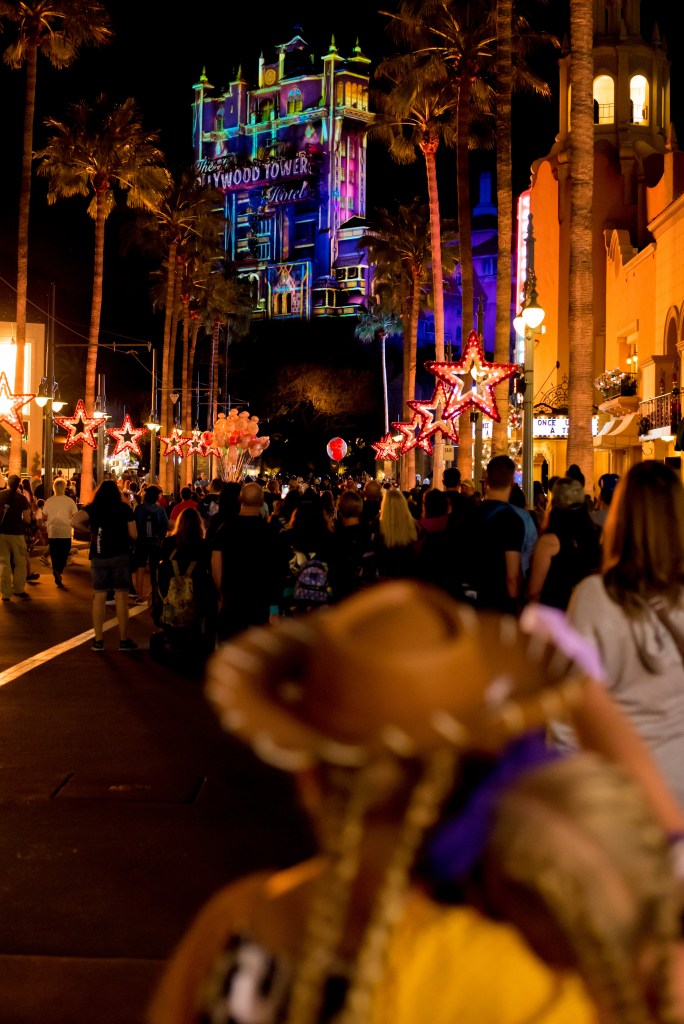 We arrived just as the Beacon of Magic was lighting and watched the short show on the Tower of Terror. The people moving around is my favourite part of the projection.