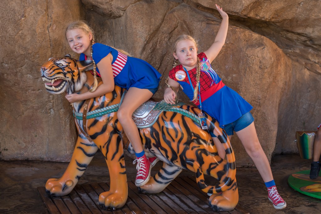 As it was really hot, we decided to walk back to the hotel for a few hours in the pool before returning to the parks later (one of the nice things about winter months is that it does cool down in the evening). We did still have to stop at every photo prop on the way out though which is the norm for my two (and they have to have each photo taken twice so they can swap places!) but as Steve was in the world’s longest Starbucks queue it at least killed a bit of time.