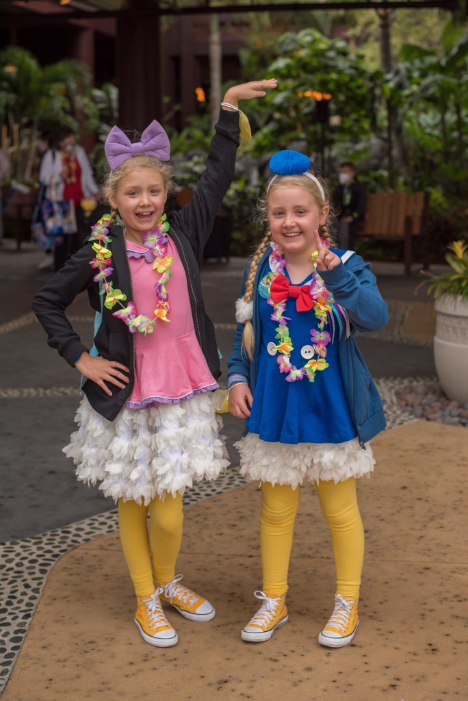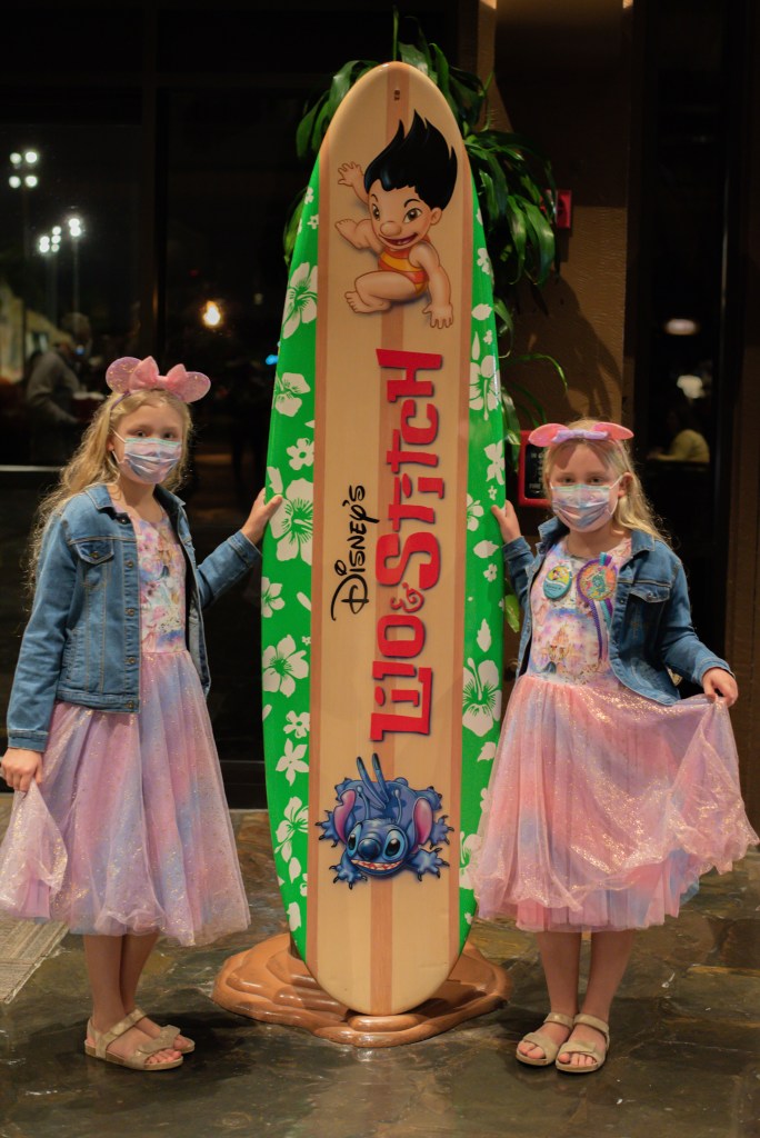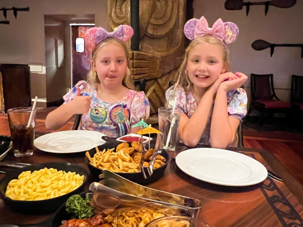 We got a message to say our room was ready so decided to head back to the hotel and give ourselves plenty of time to settle in and get changed for our meal at Ohana. The room was lovely (the subtle Moana refurbishments are very cute) and there was plenty of space for all our cases. Obviously, even though it was freezing, and we had hardly any time, the girls decided they wanted to go in the pool, so off we set (with Steve and I wrapped up to keep warm!) The girls had fun testing out the slide and the main pool, and Steve and I tested out the beverages, before we had to head back to get ready. A quick hairbrush and clothing change and we were ready to walk across for our tea. The resort is quite spread out, but it doesn’t take long at all to get anywhere.
