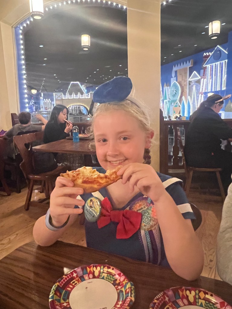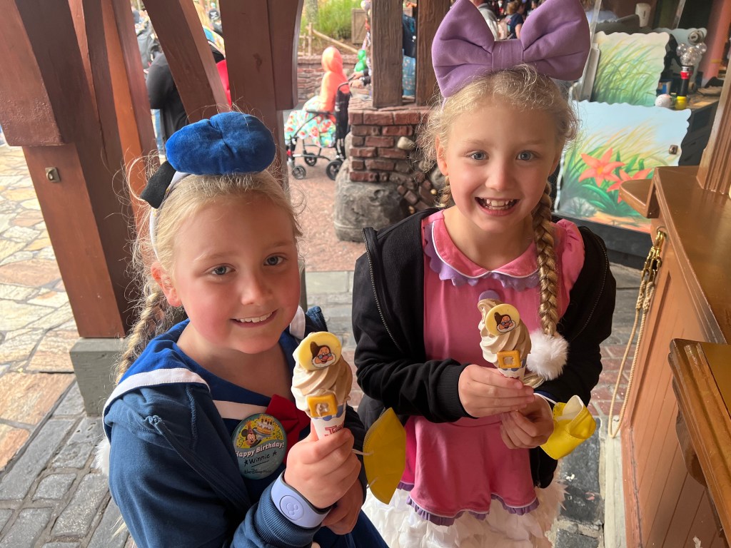 Anyway, we said goodbye and headed for the People Mover which was the girls’ first choice. We then did a few rides with small queues such as the carousel, grabbed a couple of 50th anniversary 7 dwarf ice creams of the day for the girls (Polly wasn’t keen on the coffee flavour!!) and then sat down for a quick lunch at Pinocchio’s Village House.