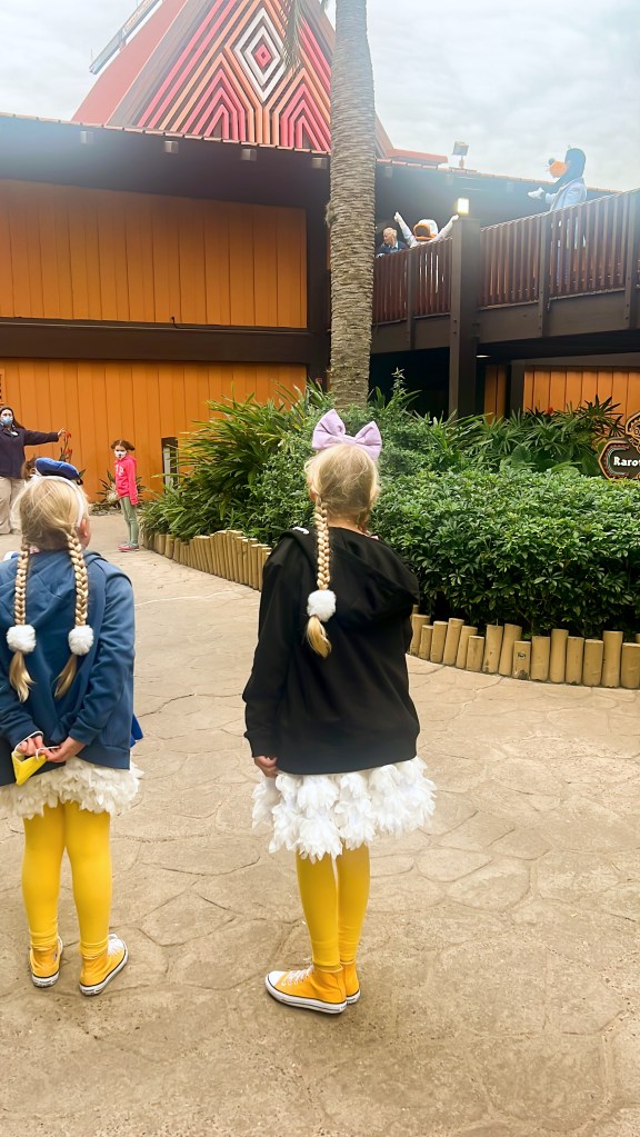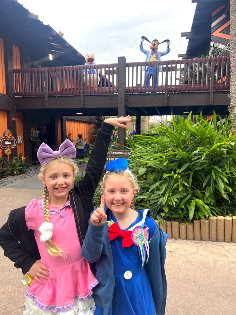 One of the reasons we’ve always avoided this hotel, aside from the cost, is that it always feels a bit chaotic, and today was no different. We had already checked in online but went to the desk to double check a few details with the intention of then leaving our bags with bell services. However, it was utter chaos with a huge queue of people outside waiting to store luggage, so Steve took the cases back to the car. Just as we’d finished helping him to pile them onto a trolley, a Cast Member came past in a golf cart and told us that there were some characters out on the balcony to the side of the lobby. The girls rushed to see who it was and were so excited when they saw Donald and Goofy!