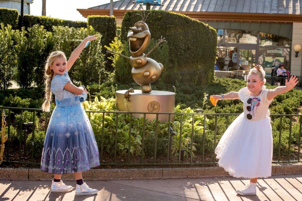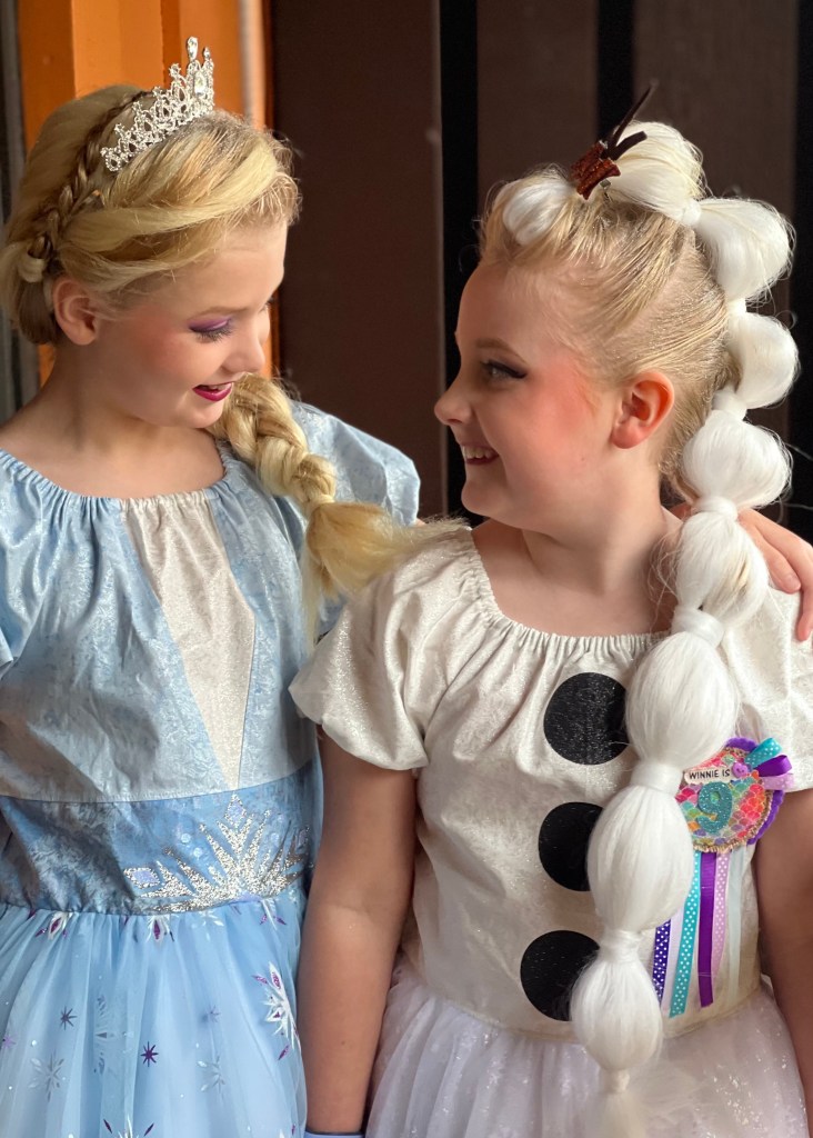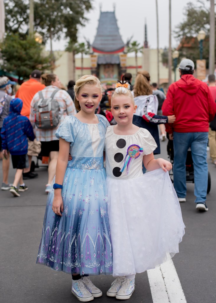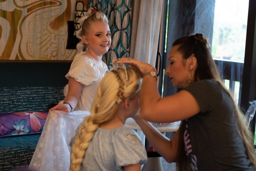 So, I clearly got my days muddled up as today wasn’t Animal Kingdom at all, but we did need an early start as we had booked a lady who used to work at Character Couture to come and do in-room makeovers for the girls at 7.30am! We debated whether to do this or not as with Bibbidi Bobbidi Boutique, it was the experience of being in the castle that the girls loved rather than the actual styling (we usually ended up in one restroom or another redoing the hair, so it didn’t pull so much within an hour or so!) but after discussing it with the girls they decided that they’d like to give it a go. Winnie decided she’d prefer the makeover to not be on her actual birthday as that day would be busy enough, so we opted for Birthday Eve-Eve! As she didn’t want a new outfit for the big day itself (she was set on wearing 50th Donald for that) I decided to make them special dresses for makeover day instead, and they chose Olaf and Frozen 2 Elsa.