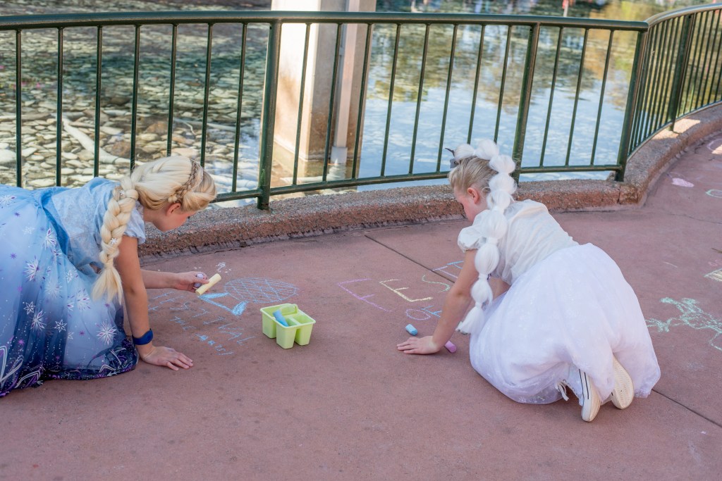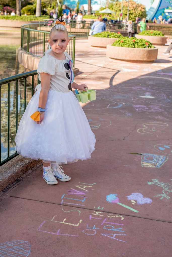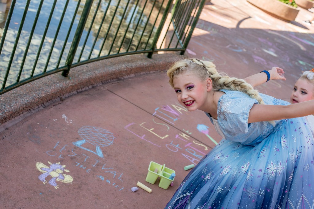 The girls then spotted some pavement chalking, so went over to try that (yes, in the white dress!! before we headed to Soarin’. We then did Spaceship Earth (because after burning the wax melts with this smell almost constantly in our house since Christmas, we couldn’t not!) before heading back to finish the other half of World Showcase.