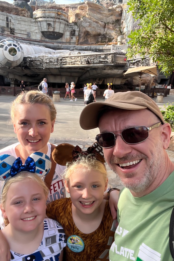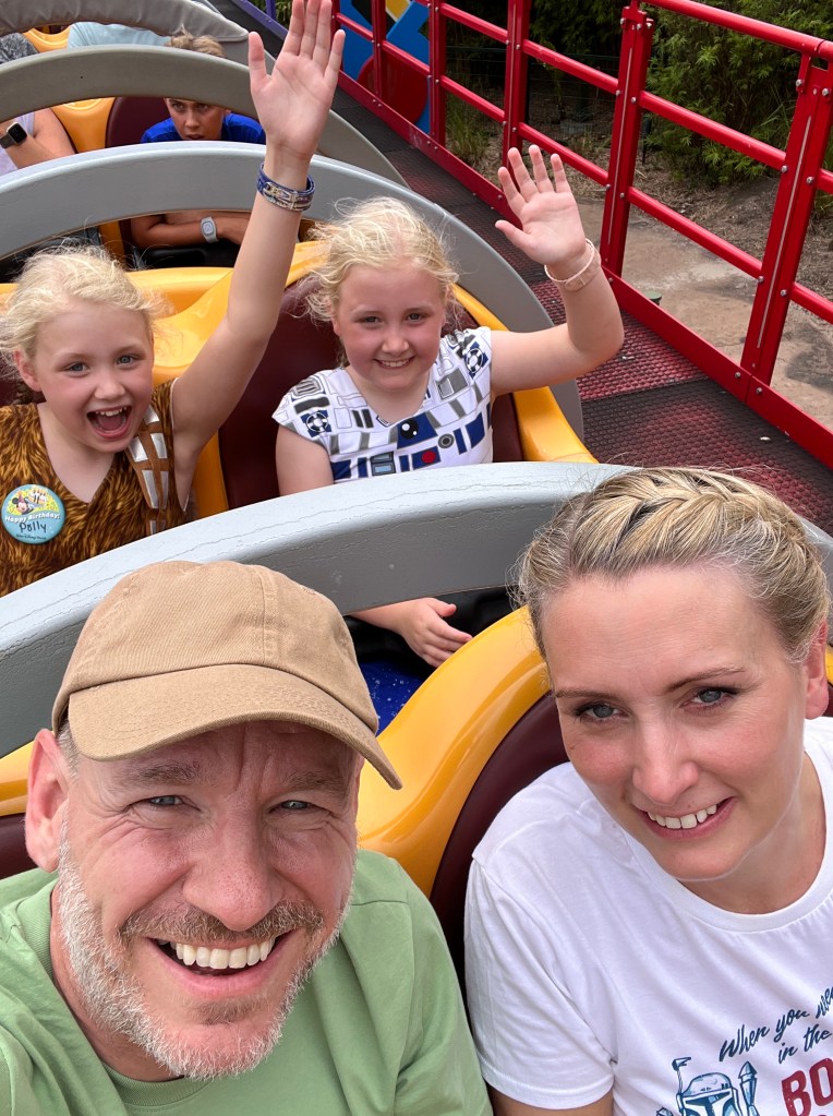 We had got a Lightning Lane for Rise of the Resistance so decided to rope drop Runaway Railway because the girls love it. Steve opted out to drink his much-needed morning brew instead, and when we got to the front, we realised we’d left Polly’s glasses with him, but despite it being blurry she still loved it. As we were on so early, we managed to get on Toy Story Mania in extra early morning hours as well. I actually beat Steve! As we got off Winnie said she got the worst score. I asked why and she explained that she got 69000 and that’s bad because people in her class at school are silly about the number 69. Now, we try to be very open with the girls and make them feel comfortable talking about anything. I was fine giving them an impromptu sex education lesson when it came up at bedtime a few weeks ago (thinking on the spot I ended up using Stitch, Topolino’s Donald, and regular Donald (similar DNA!) to represent the sperm and their ladybird nightlight as the egg. Maybe a bit unconventional but got the job done) but there was no way I was getting into that conversation so changed the subject as quickly as possible!
