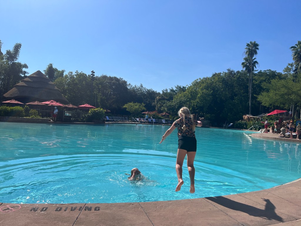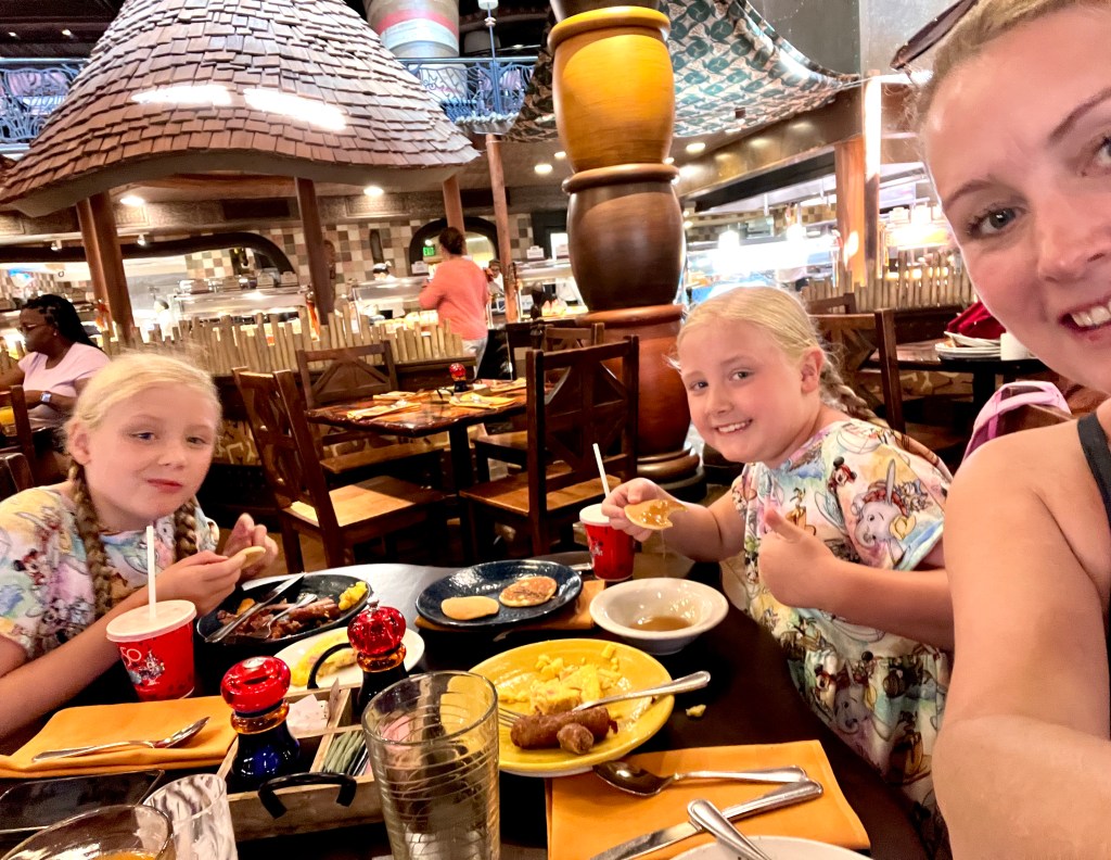 Anyway, it was pretty much time for our Boma breakfast reservation by the time everything was sorted (although we still have to drop the car off at the airport at 8.30 on Friday then get back here as we were taking cruise line transport from the airport). I’ve said before that I’m not a huge breakfast fan, so I pretty much filled up on plantain and asparagus with a side of French toast bread pudding. The girls had the usual breakfast but with an excess of sliced ham, and Steve tried a bit of everything. I know people love this breakfast, and it does have some nice options, but for us I don’t think it was worth the money and isn’t somewhere we’ll rush back to. Today though, it was just what we needed. We planned to go to the pool for the rest of the day. The girls took their plane bags poolside which are full of notebooks, sticker books, sketch pads and reading books, and had a lovely time mixing playing in the pool with doing various activities. It was pretty toasty though and Winnie had been asking to go to Target for some flip flops, so after a while Steve said he’d take the girls and I could have an hour. It was heavenly and I managed to finish my book. When they got back the girls were very giggly and when I asked why they said to ask Steve. Turns out they wrapped him round their little finger and managed to get an ILY doll and an outfit each. Luckily, it wasn’t the huge toys ge sent me a photo of, but I’ve no idea how well fit them in the luggage!!