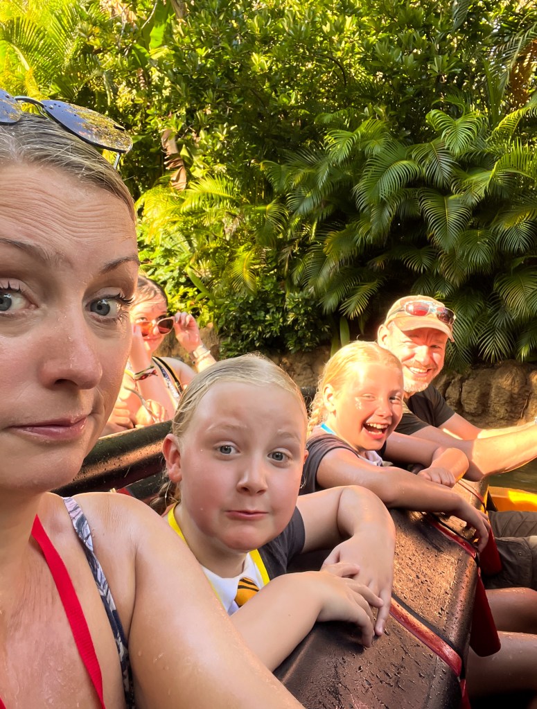 The girls then went on Pteradon flyers to dry off a bit, which they love, but won’t be able to go on soon as Winnie is almost too tall. before we opted to get even wetter on Ripsaw falls and the rapids (I sat out of that one as decided my broken bod needed a break!) Everyone was suitable soaked at this point. The girls had loved the morning of trying new rides but decided there was nothing else they were desperate to do and that they’d really like a swim before heading back later, so we set off in a squishy walk to the hotel. Once there we settled by the pool, drying our wet clothes over a sunbed in a decidedly classy manner!