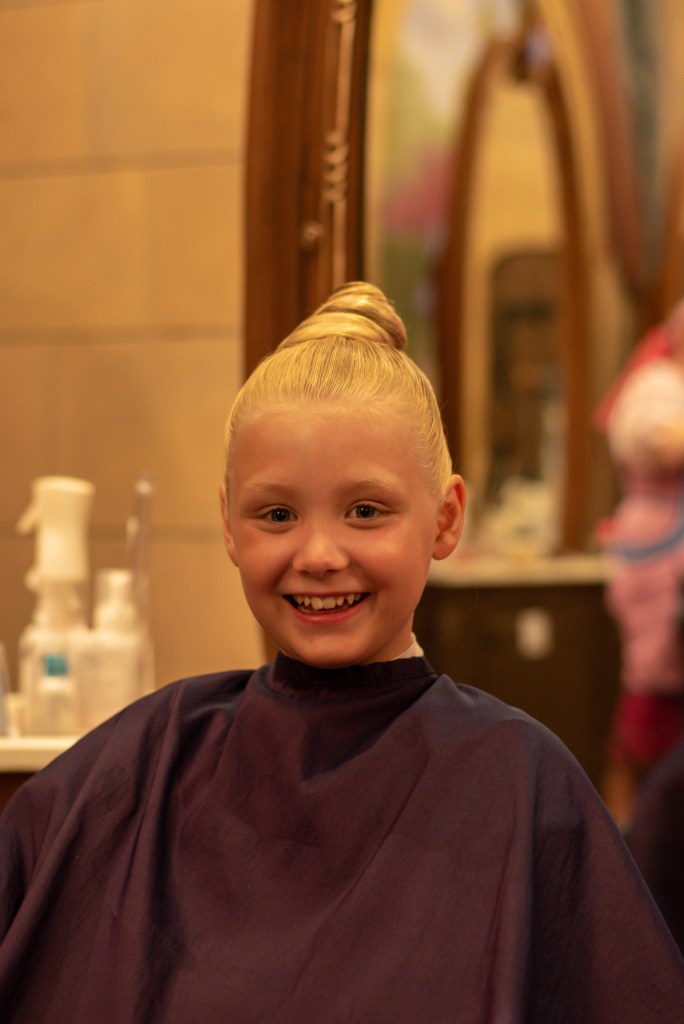 Today was the day of the girls’ Bibbidi Bobbidi Boo appointment. They have always loved visiting there on previous trips, but the hairstyles are very tight and both struggle with them, so I was actually glad to get an afternoon appointment on an early park close day as I knew otherwise, I’d end up redoing their hair in the toilets at some point during the day! We decided not to head into the park until our appointment time as the girls wanted a few hours in the pool before having their hair washed and dried, so we didn’t set off until lunch time. We thought we had plenty of time, but the monorail was held up for ages, so we were getting a bit twitchy. Luckily it started running just in time, and we arrived slightly early for our appointment.