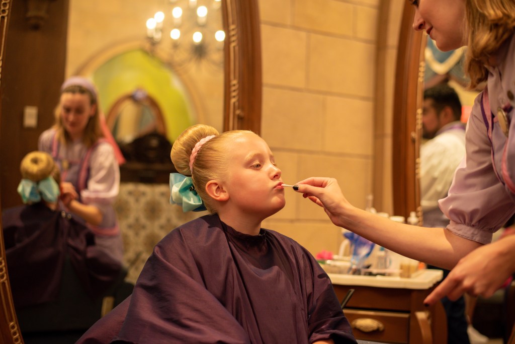 For those who haven’t been before, you enter the first room and check in and then look at which package you’d like. The basic package includes hair, make-up (eyeshadow, blush, and lip gloss) and a t shirt. The next two include dresses as well (one the more expensive version than the other) but as we’d taken our own dresses (I couldn’t risk buying a dress there as the girls have sensory issues especially with ‘itchy’ fabric) we got the cheapest package.You then go into the room with all the dresses and wait to be called to the changing room. A fairy godmother hangs up your outfit regardless of whether you buy it there or bring from home, so the experience is identical. You then get called in where hair is checked to see if Pascal is hiding in there (!!), choose your hairstyle and a bit of magic happens before you get changed.
