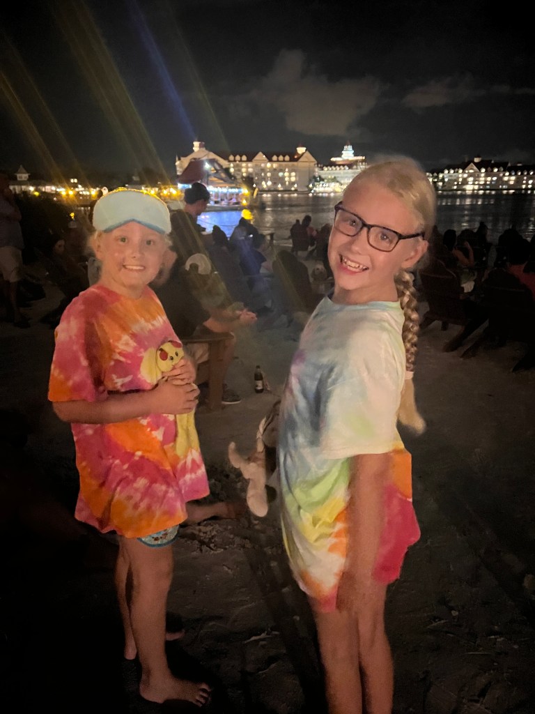 We did hope to stay up for fireworks, but the girls were really flagging, so headed to the room instead to recommence operation clothes dry. The girls got into their nighties (adult t shirts they tie dyed at Port Orleans) and got into bed.