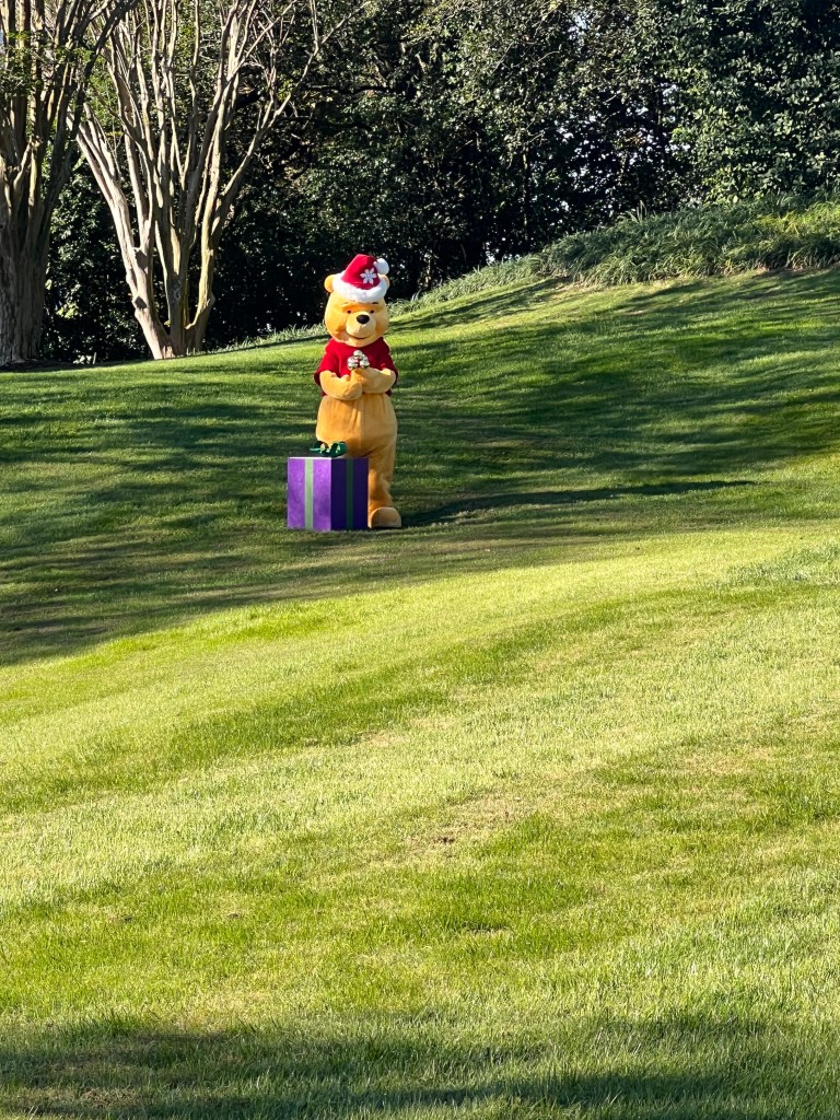 After we got off we got a few very squinty photos before heading across to Soarin. On the way we saw Pooh in his Santa hat, which was very cute.