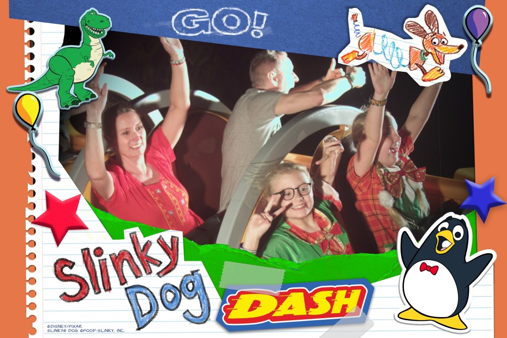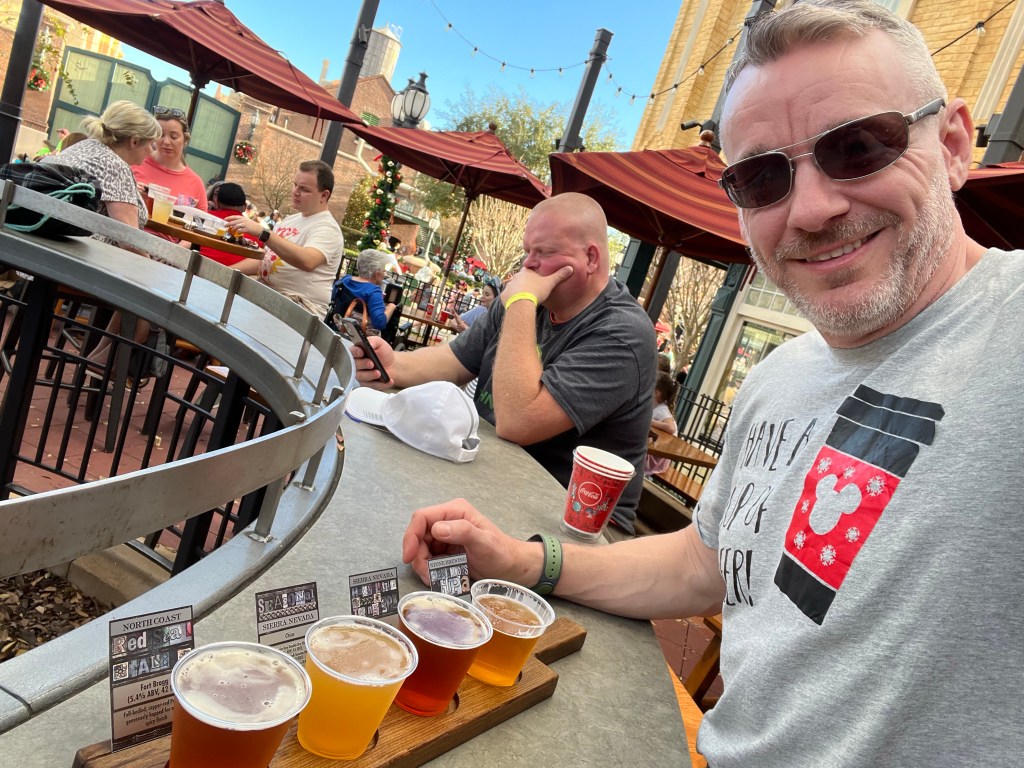 Steve missed out on the Tap House in summer, so he headed there while we went to the Mickey shorts film, and then we all did One Man’s Dream before Slinky Dog in the dark. The combination of a few small beverages at Epcot and a beer flight at the Tap House put Steve in a rather merry mood, and the girls were in hysterics at him trying to learn their secret handshake, and then even more giggles followed when they saw our Slinky photo of him posing for the camera on the complete wrong side!!