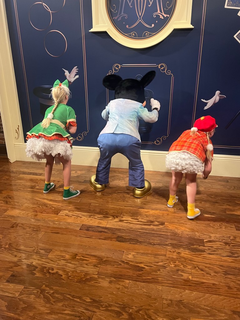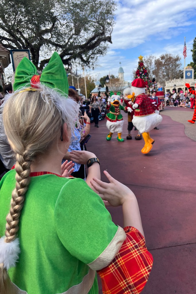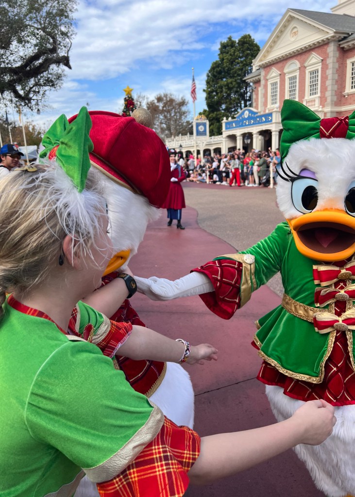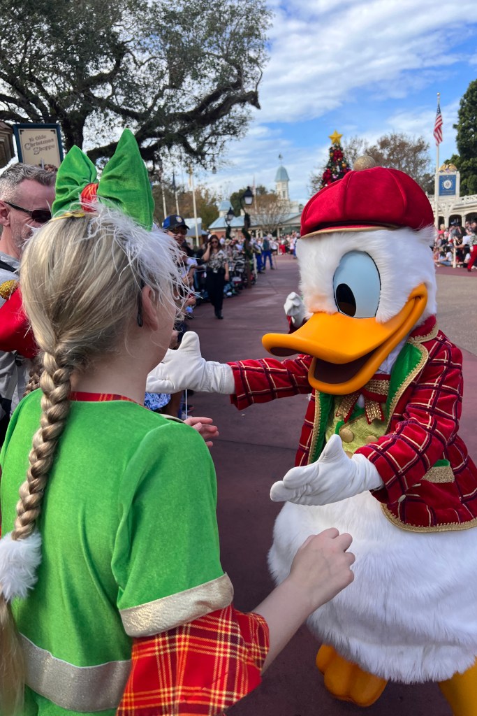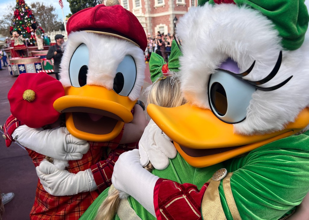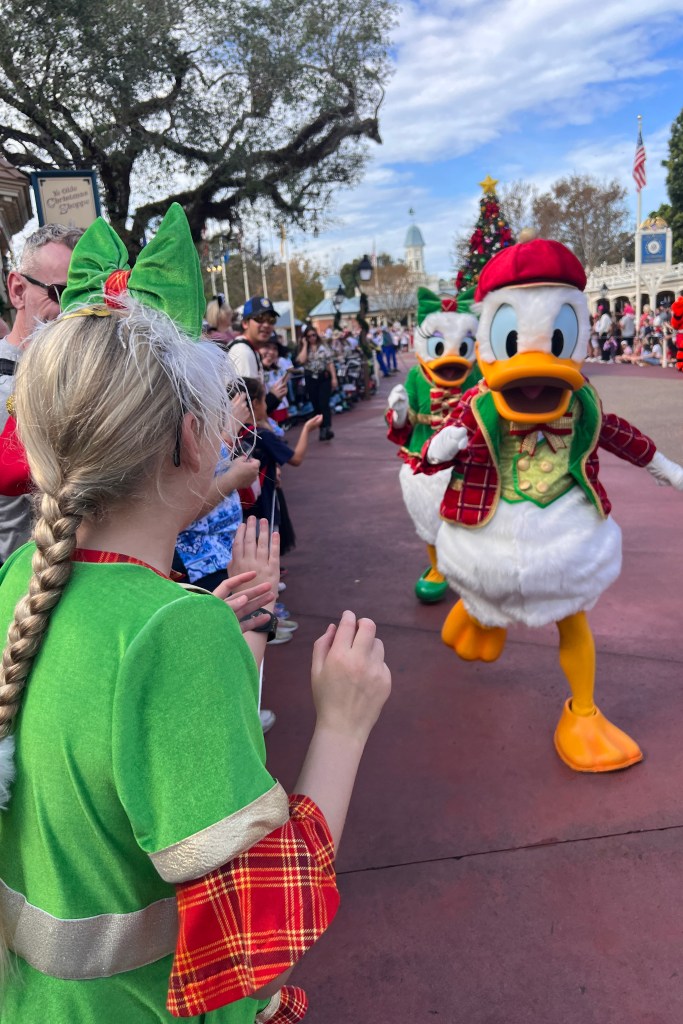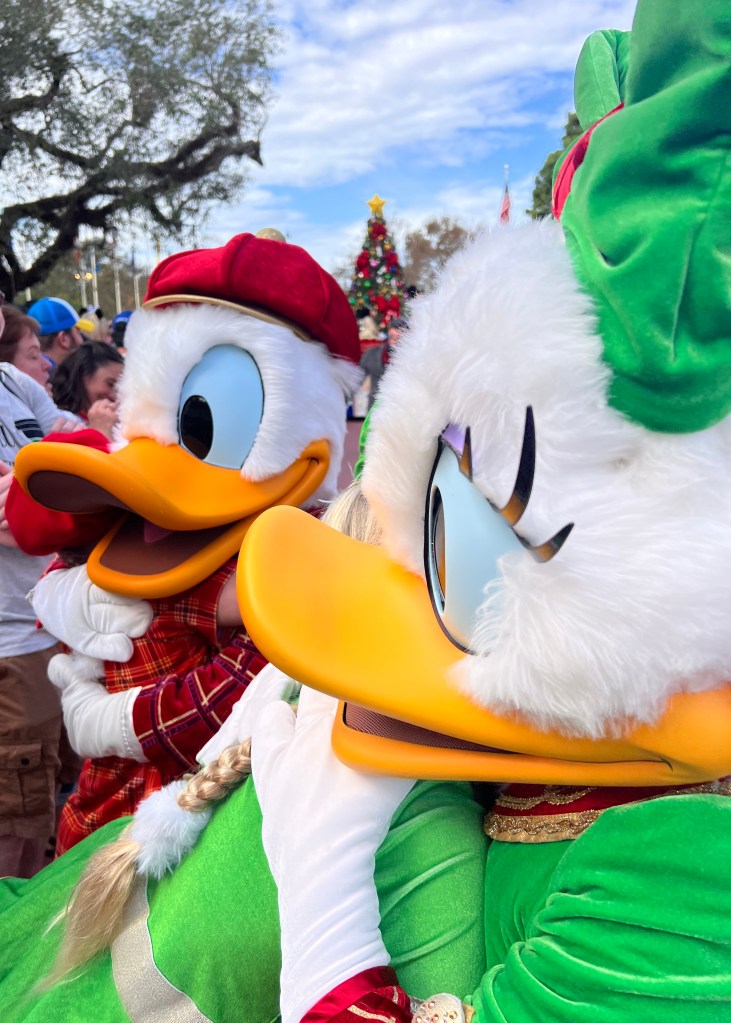 Although we hadn’t seen any rain ourselves, the ground was slightly damp (and I mean very slightly) which meant that a lot of the parade characters couldn’t dance. Although it’s nice to see the dancing, without it the walking characters are free to roam meaning you get a lot more interaction which makes it so much fun. This time it was Gepetto who saw the girls and ran to tell Donald. Donald saw them and started jumping up and down, frantically trying to get Daisy’s attention. They then both ran to the girls and spent forever hugging them. Polly said Daisy just didn’t want to let her go, and it made her so happy. They only did let go because Mickey’s float was about to run them over!! It was honestly the perfect moment, and so magical.