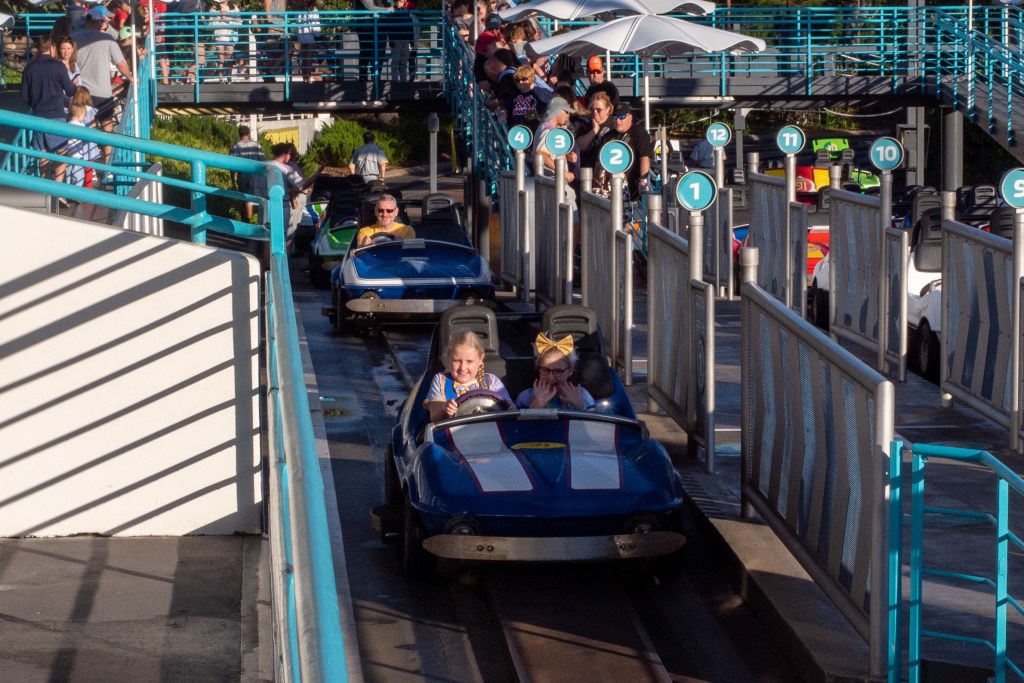 We arrived way earlier than expected as we were up and dressed super quickly and arrived at the bus stop just as the first bus was driving up. Steve obviously went straight to Starbucks while we waited at the bridge to Tomorrowland to rope drop the classic that is Tomorrowland Speedway! As it turned out, Steve was super-fast so we got to polish off our Starbucks before the park opened, meaning he endured Speedway with the girls whilst I spectated.