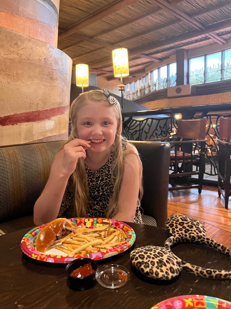 We were meant to be heading to O’hana this evening. After a lot of checking, I’d manage to modify our reservation to the perfect time to allow us to eat and get to Magic Kingdom in time to ride People Mover in the dark before watching the fireworks. However, after stopping for an hour and knowing we had all the packing to do, none of us could face going out again. We thought about going to the Sanaa lounge but instead opted for Victoria Falls, the lounge area just above Boma. We had a few drinks and some lovely food (the girls had food from The Mara but also ate some of ours) and it was really lovely.
