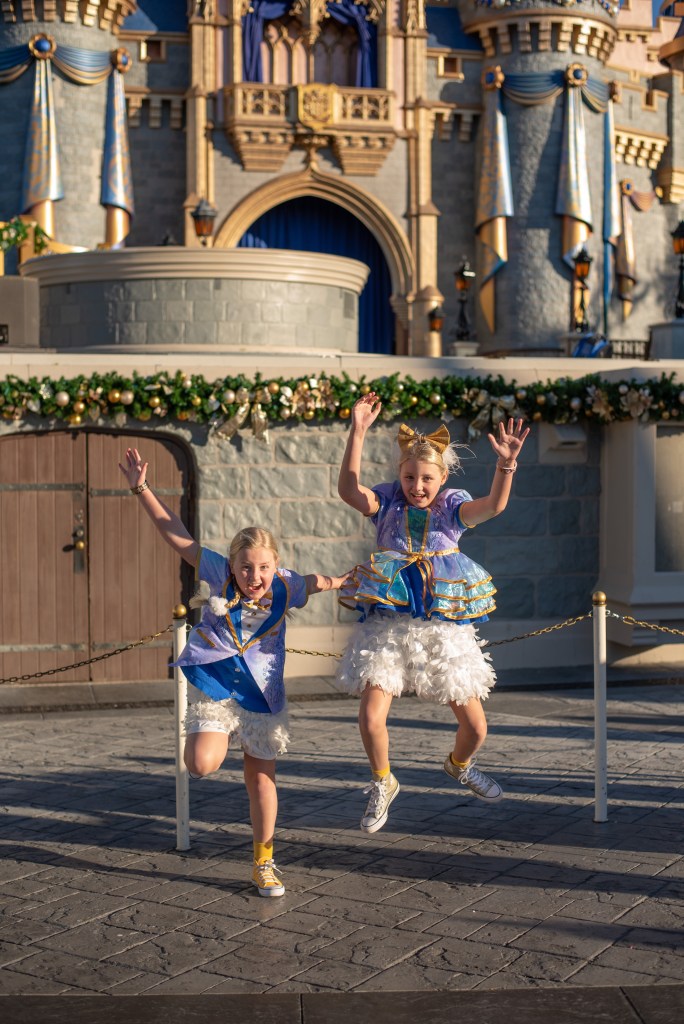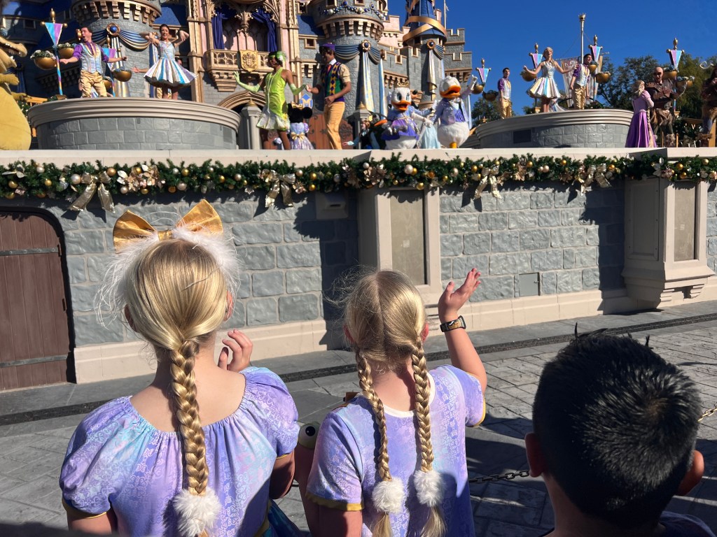 Today we’d decided to spend our last full day in The Magic Kingdom. As it was the half marathon, we knew there’d be a lot of road closures and that the journey would take a lot longer than normal, so we headed to the bus stop at 7.30am hoping to make rope drop but knowing that it might not happen. The bus arrival time kept getting pushed back, but it eventually came at 7.50 and amazingly, despite almost stationary traffic at one point, we made it into the park before 8.30. The girls really wanted to watch the welcome show one more time with the characters in their 50th outfits, so we had a look around the Emporium, chose their trip pin and met up with Steve who’d been on a Starbucks run to eat breakfast in front of the castle.