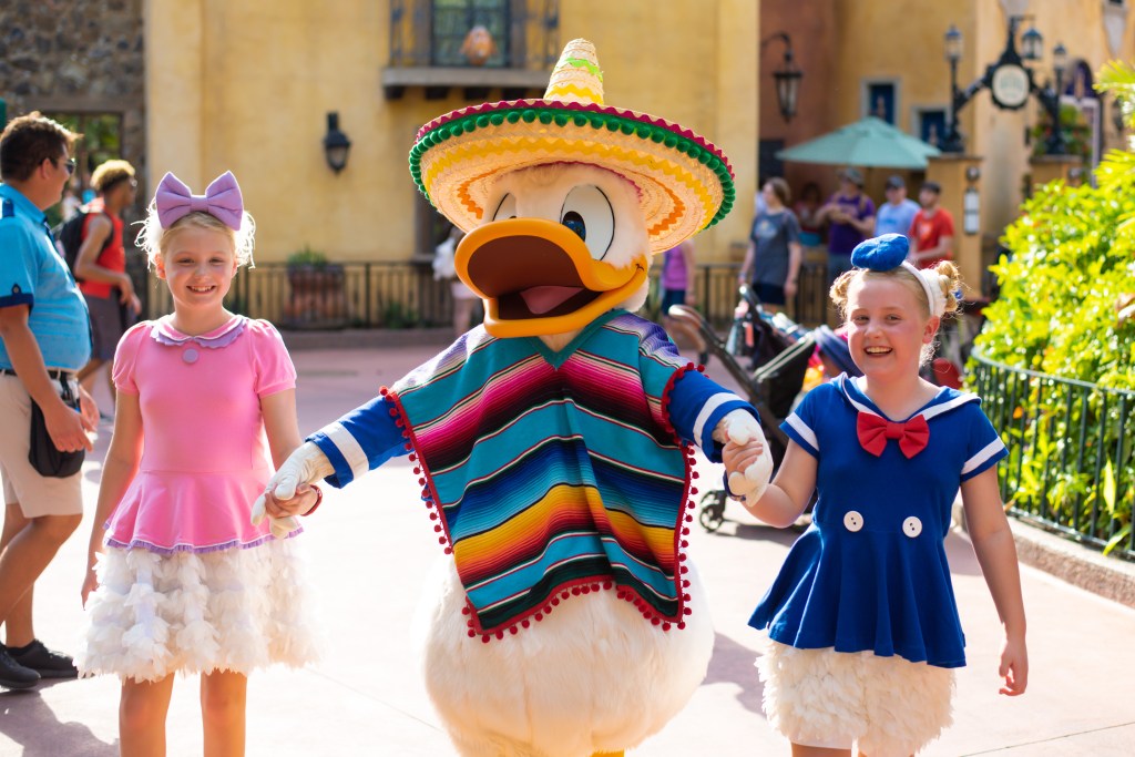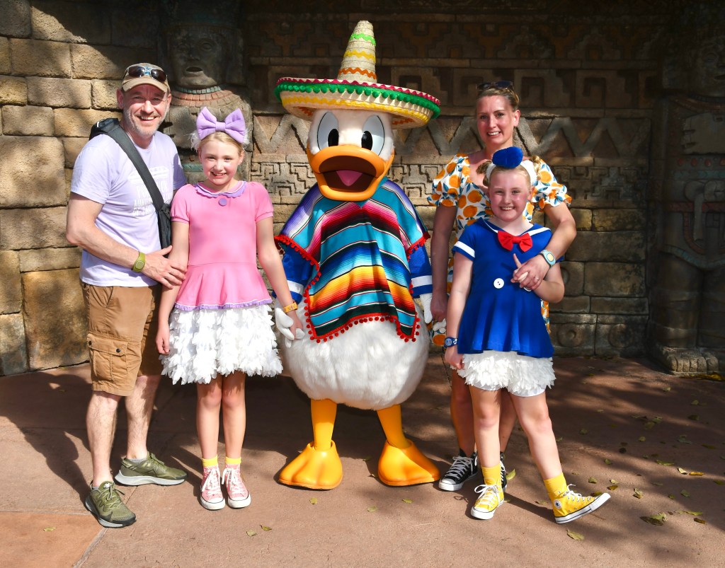 After an hour chilling by the pool we set off for Epcot. We always seem to choose the hottest days there, and it was no exception today, but the girls were determined to do the Easter Egg hunt so after riding Spaceship Earth which had no queue at all, we bought two maps and set off, making sure to stop at the booths for food and drinks to stay cool. The first stop was Mexico where Donald was still meeting, so we got in the queue which for once was in the shade, and moved quickly. Donald was so much fun. He tried to take the girls away with him, then asked me to go too! Fortunately (or unfortunately) for Steve, his handlers told him he couldn’t steal children or adults!