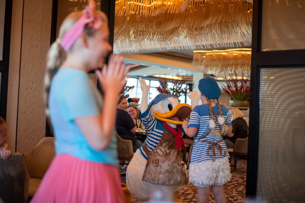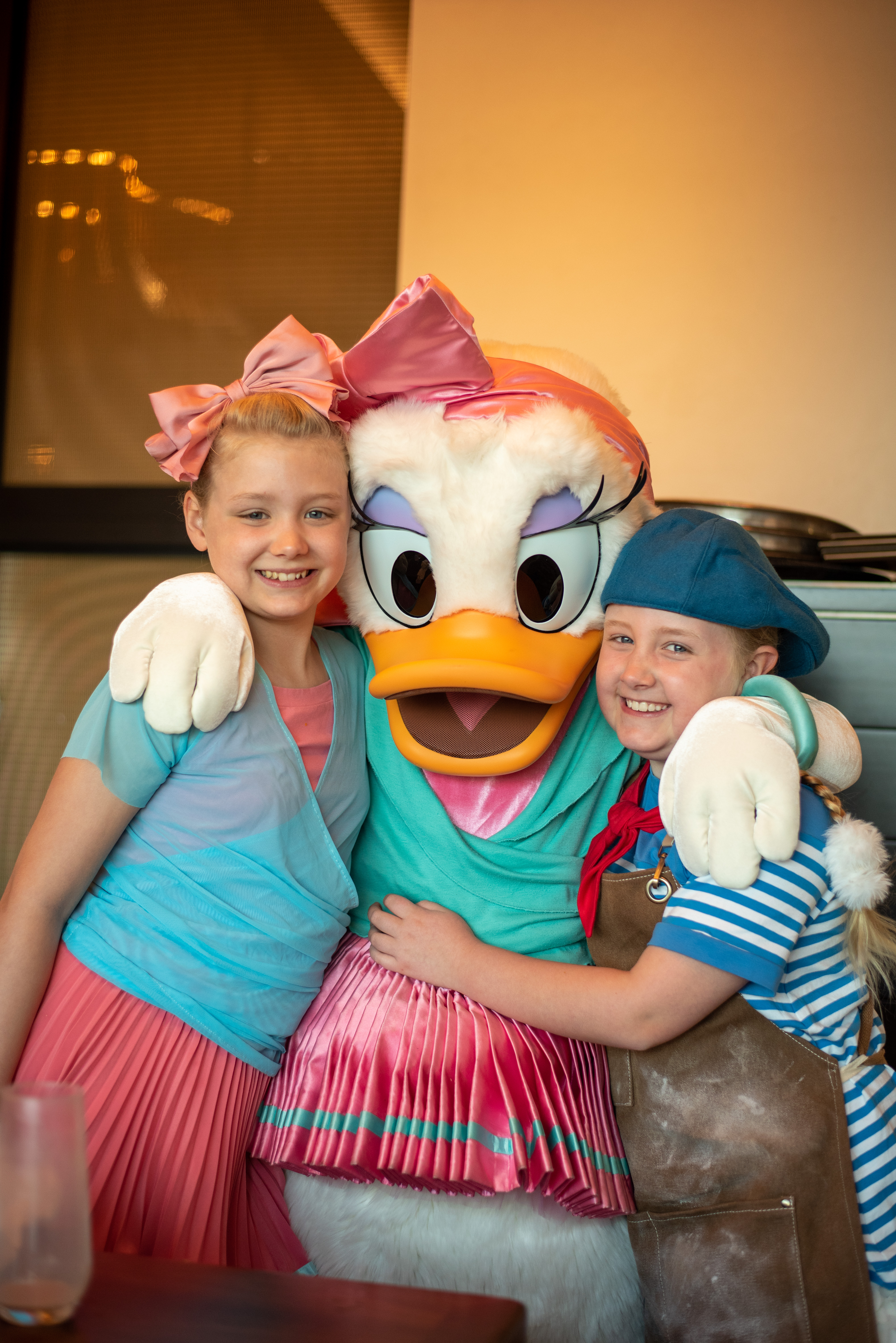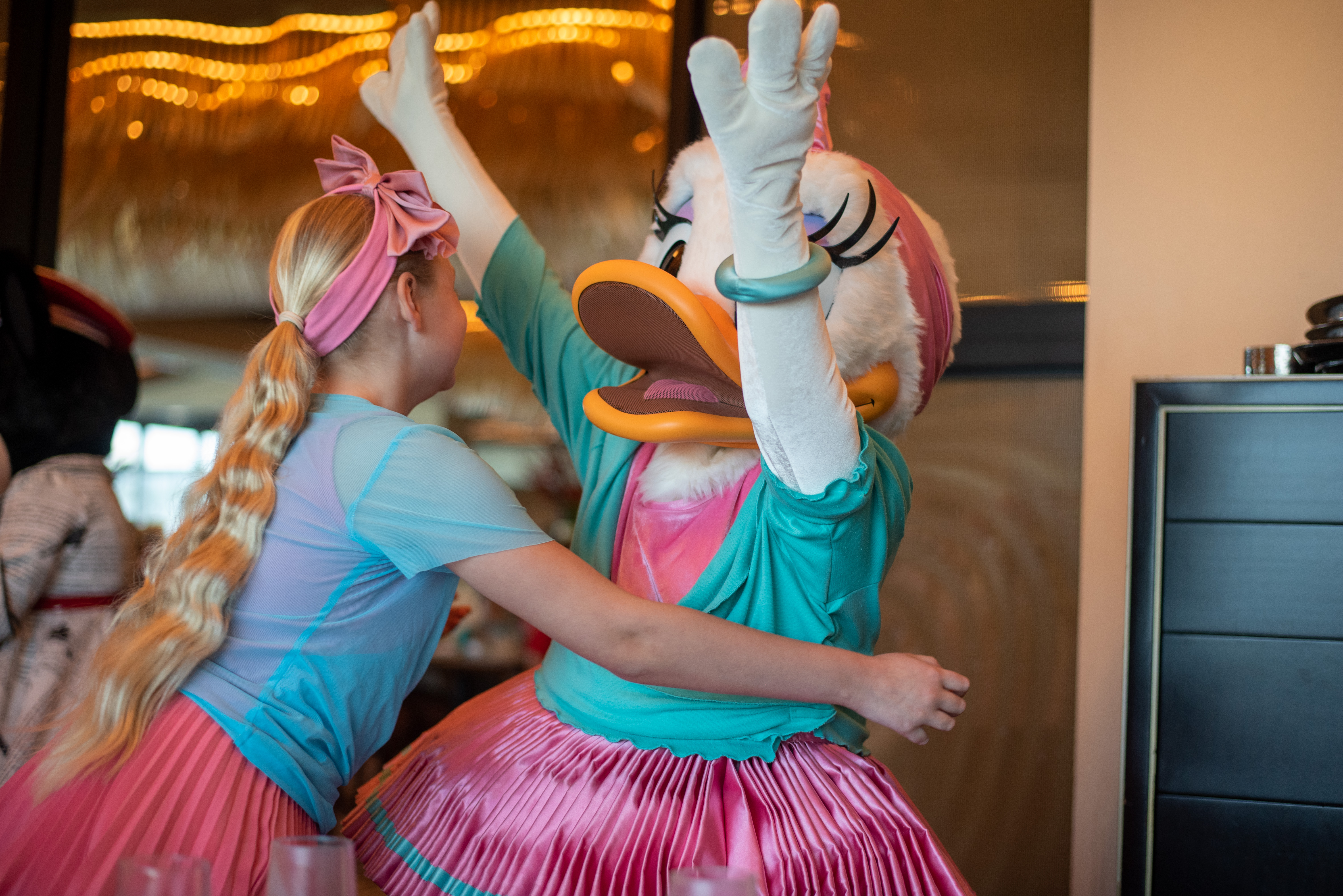 The next morning we decided to try and get a Topolino’s reservation as although we had another Magic Kingdom Day planned, it was mainly to watch Festival of Fantasy again as I’d made the girls outfits to replace their 50th ones (on their request!!) so we had plenty of time beforehand. Loads of reservations popped up in the morning so we had our pick of times. I initially chose 9am but modified as we were ready early, and we ended up being seated at 8.30am. We had the best time. We were in a little side room, but it was great as the characters spent ages with us. Donald took Winnie away to make everyone in the main dining room cheer for her and wouldn’t bring her back until they cheered loudly enough! He then directed her to do various poses for photos. She absolutely loved it.