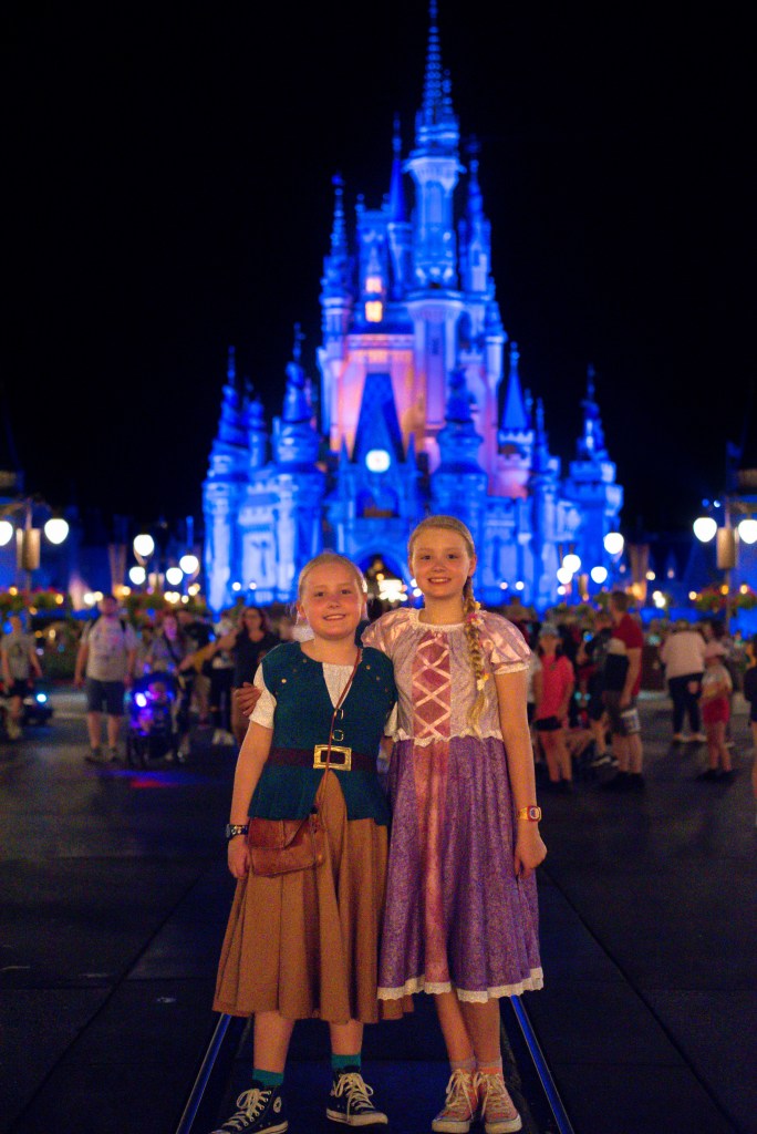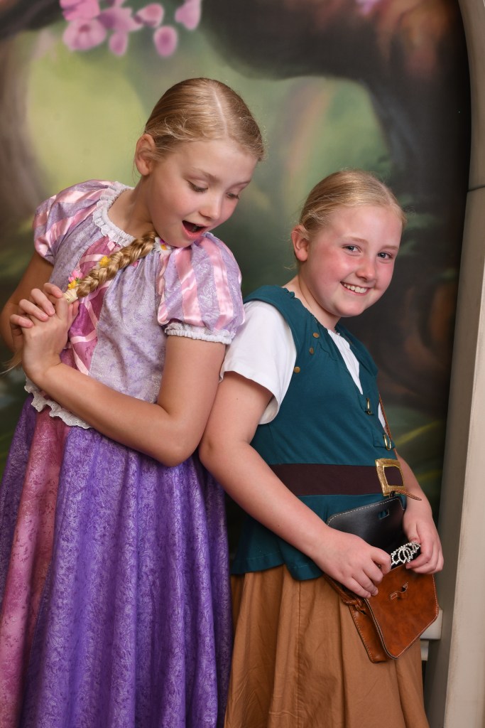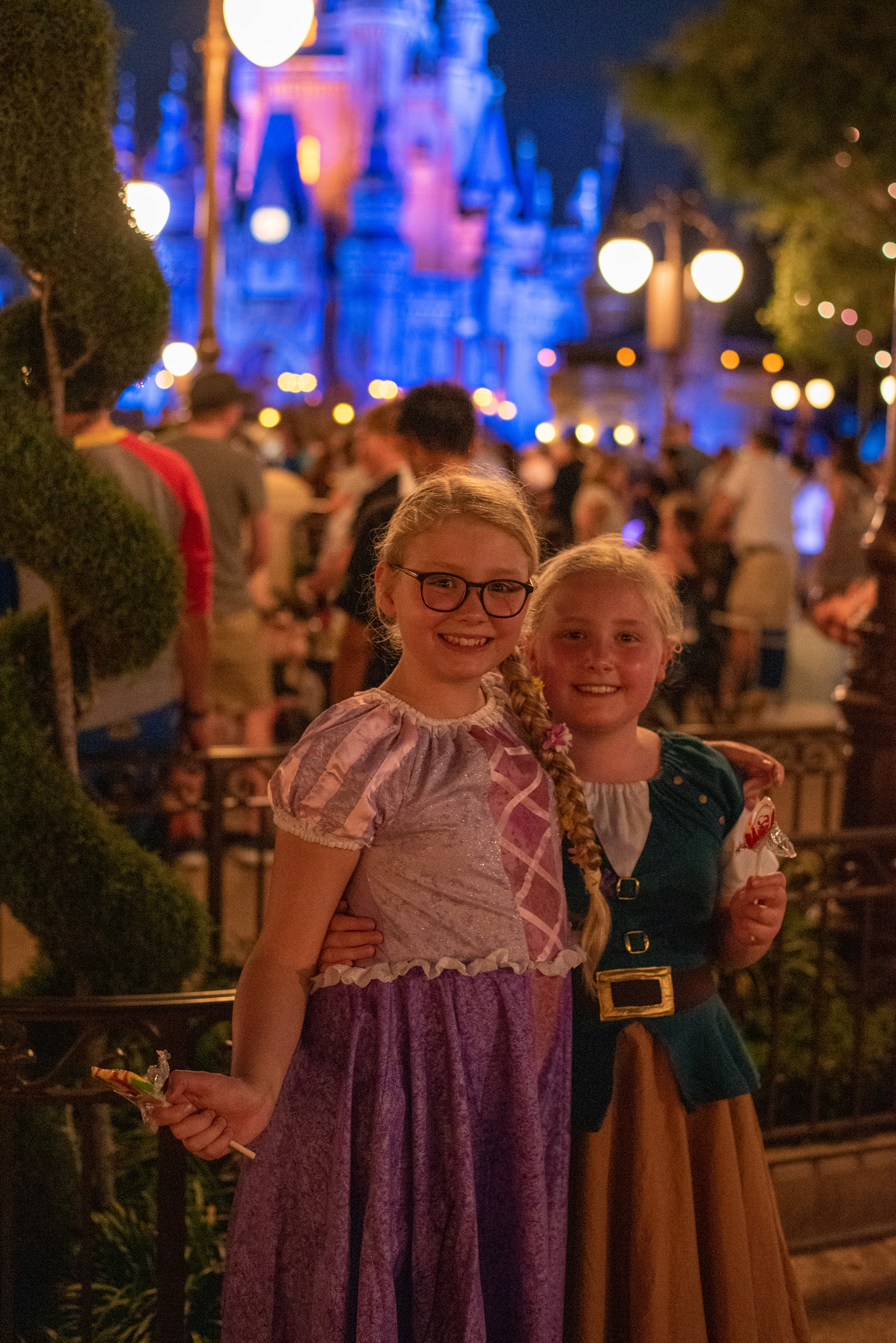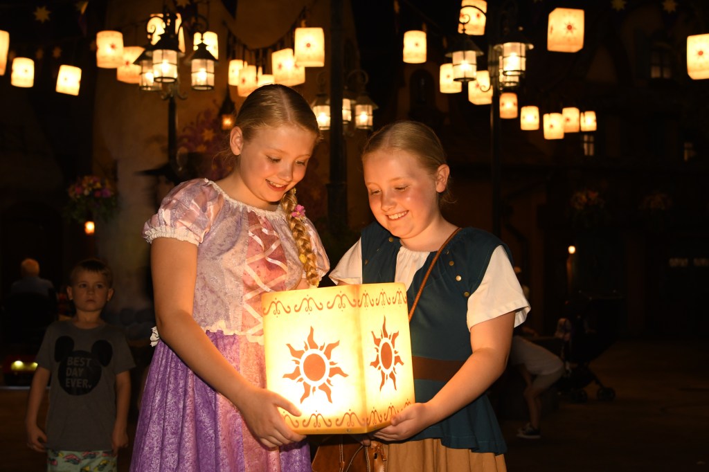 After the fireworks they played the song again, so we stayed in the garden and had a little sing and dance while the crowd cleared, although the crowd was so big it didn’t really clear at all, so we decided to make our way to the Tangled Lantern photo which is just outside the Tangled toilets. We had to queue for around 20 minutes but didn’t think that was too bad, and we had the same photographer as earlier who remembered the girls and was really great with them.