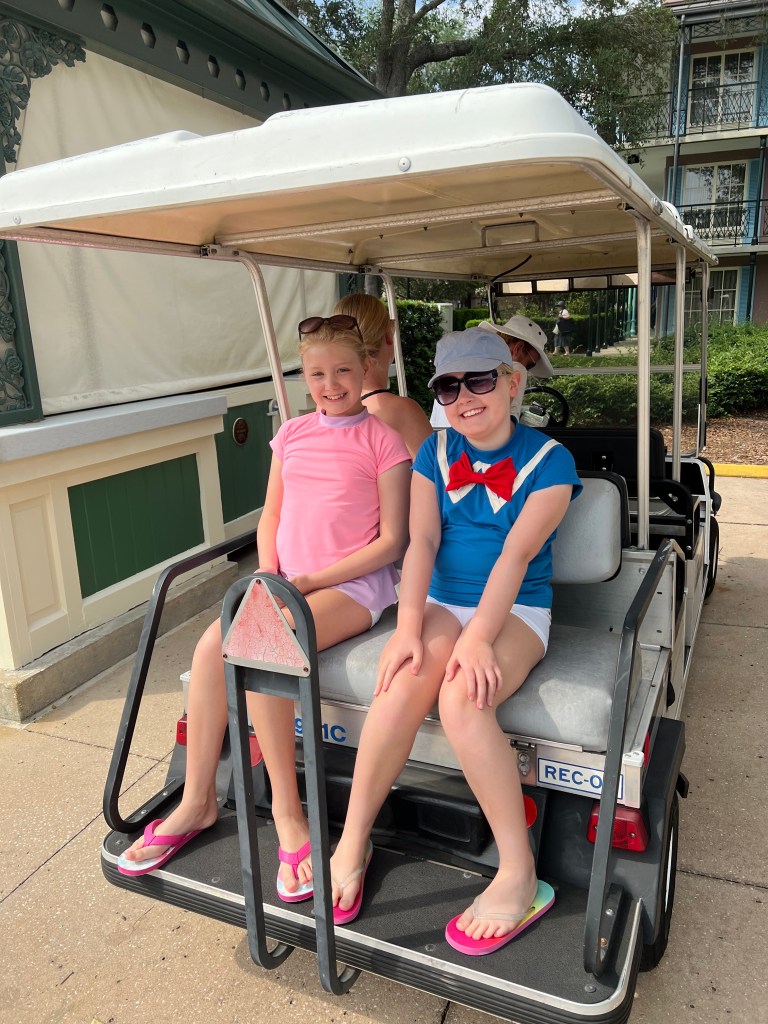 The original plan for today was to relax around the pool, maybe have a nap, and then head into Magic Kingdom late afternoon for the pre-dessert party for the first night of the return of Happily Ever After. Except, I forgot we are the family that don’t relax, and the plan quickly changed to heading into the park earlier to watch a parade and maybe do a few rides, which ended up leaving us with only a few pool hours. We got to the French Quarter pool as it was due to open, but there had been a fault overnight and the water level wasn’t right so there was a delay in opening. The girls went to have some breakfast, and by the time they’d finished there was still no sign of the situation being resolved, so the lifeguard suggested we head over to the pool at Riverside. He asked if we’d like a lift there, and the girls being the princesses they are said yes, so we got taken down on a golf buggy!