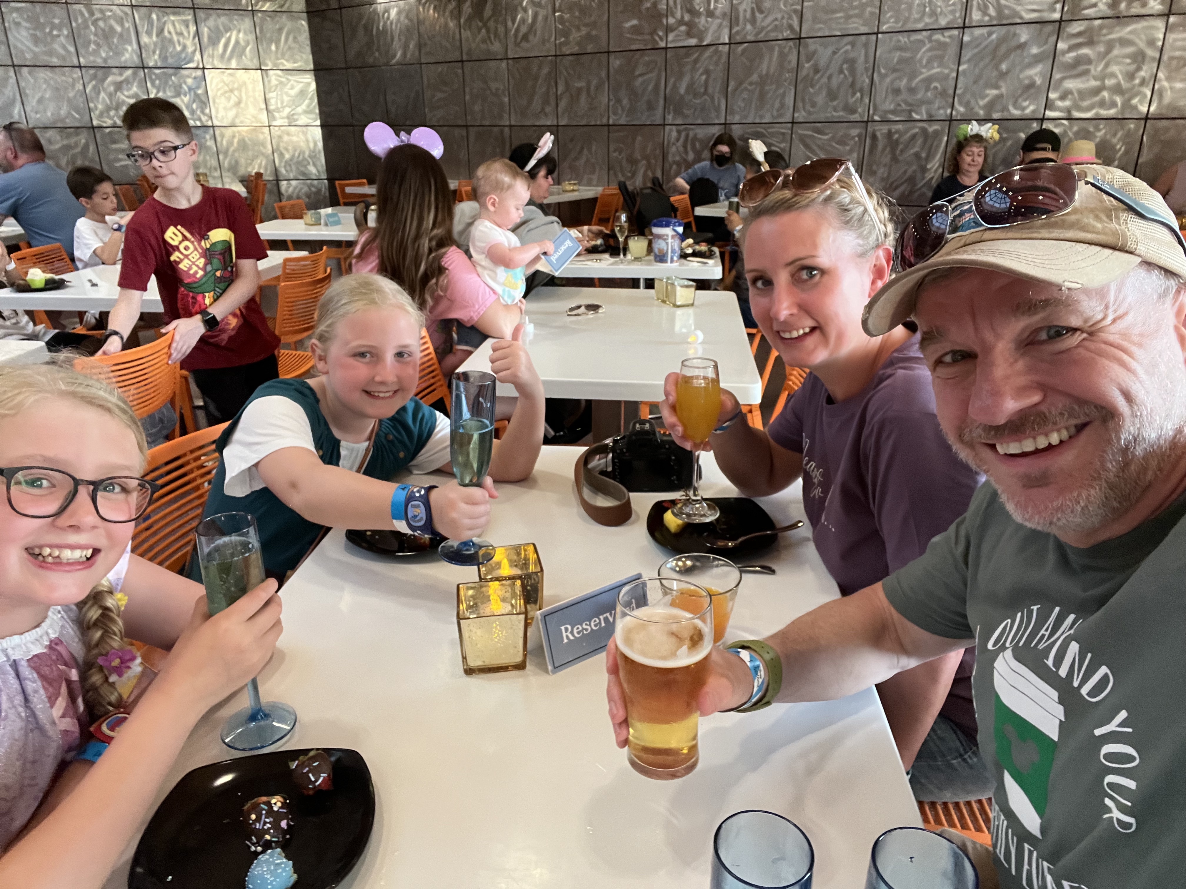 We then went to meet Rapunzel & Tiana before Winnie decided she’d like a photo shoot in Sir Mickeys. The photographer was fab and had so much fun with them. He then told them to go to the lantern photo later, which is something we’ve never done as our only late park nights are for fireworks, so we decided we’d do it. A quick ride on Pooh where all 3 of us were crushed in together on one row and we went back to Main Street to meet up with Steve with a large latte as a reward for him bringing the glasses (that he may or may not have had all along!) It was still before 6 and the hub was already getting pretty packed with people waiting for the fireworks, so we were glad we had our dessert party spot.