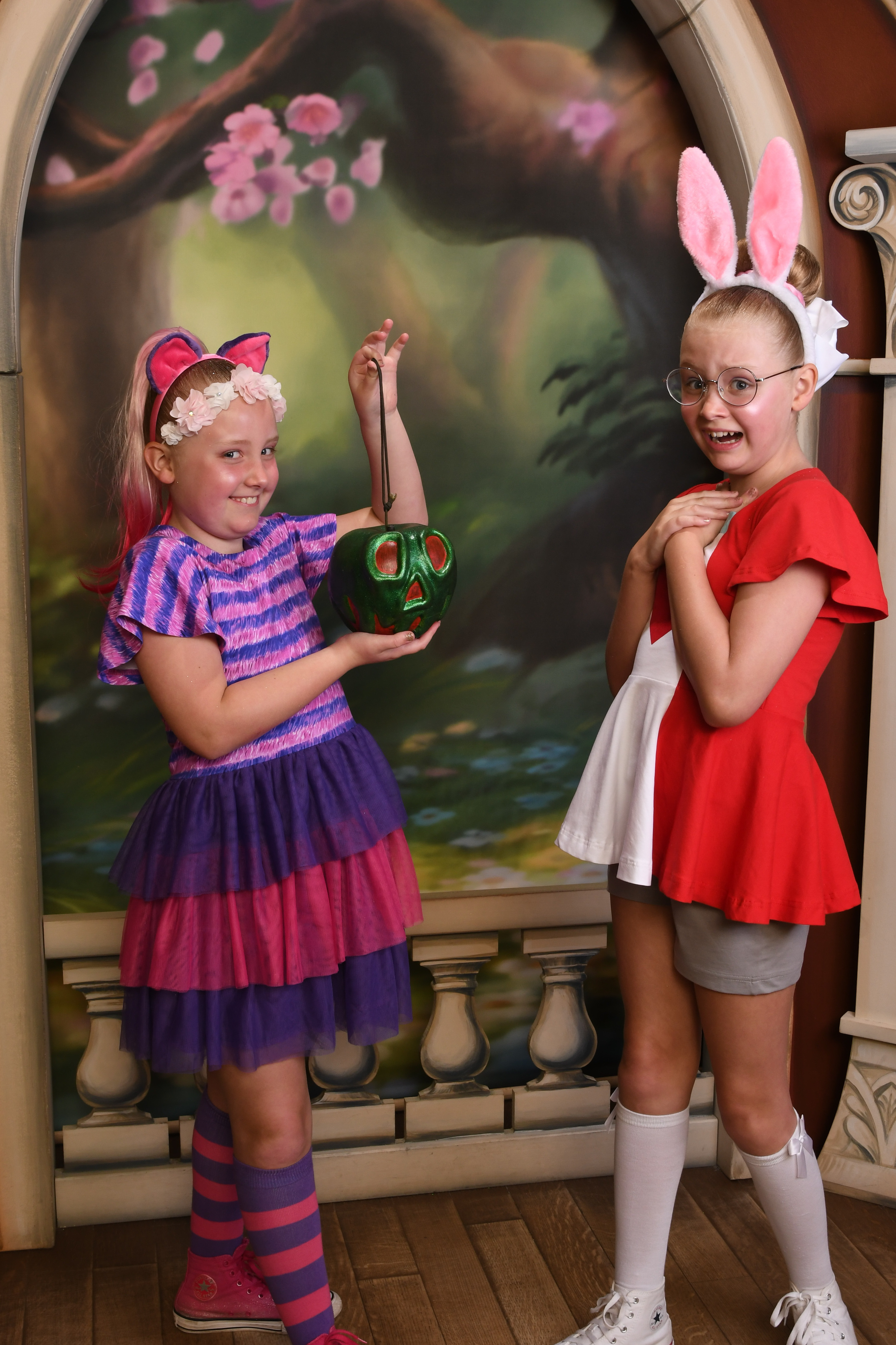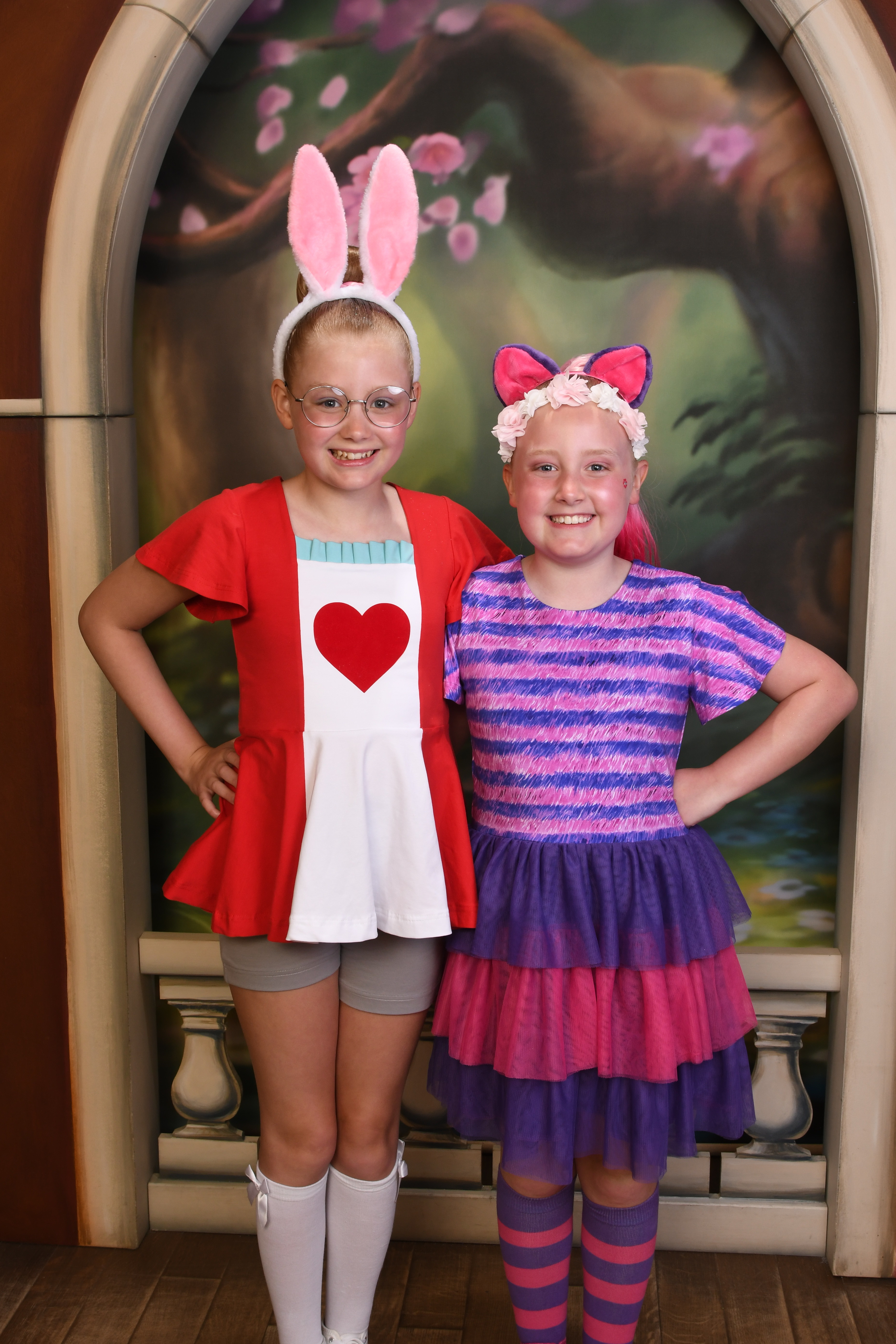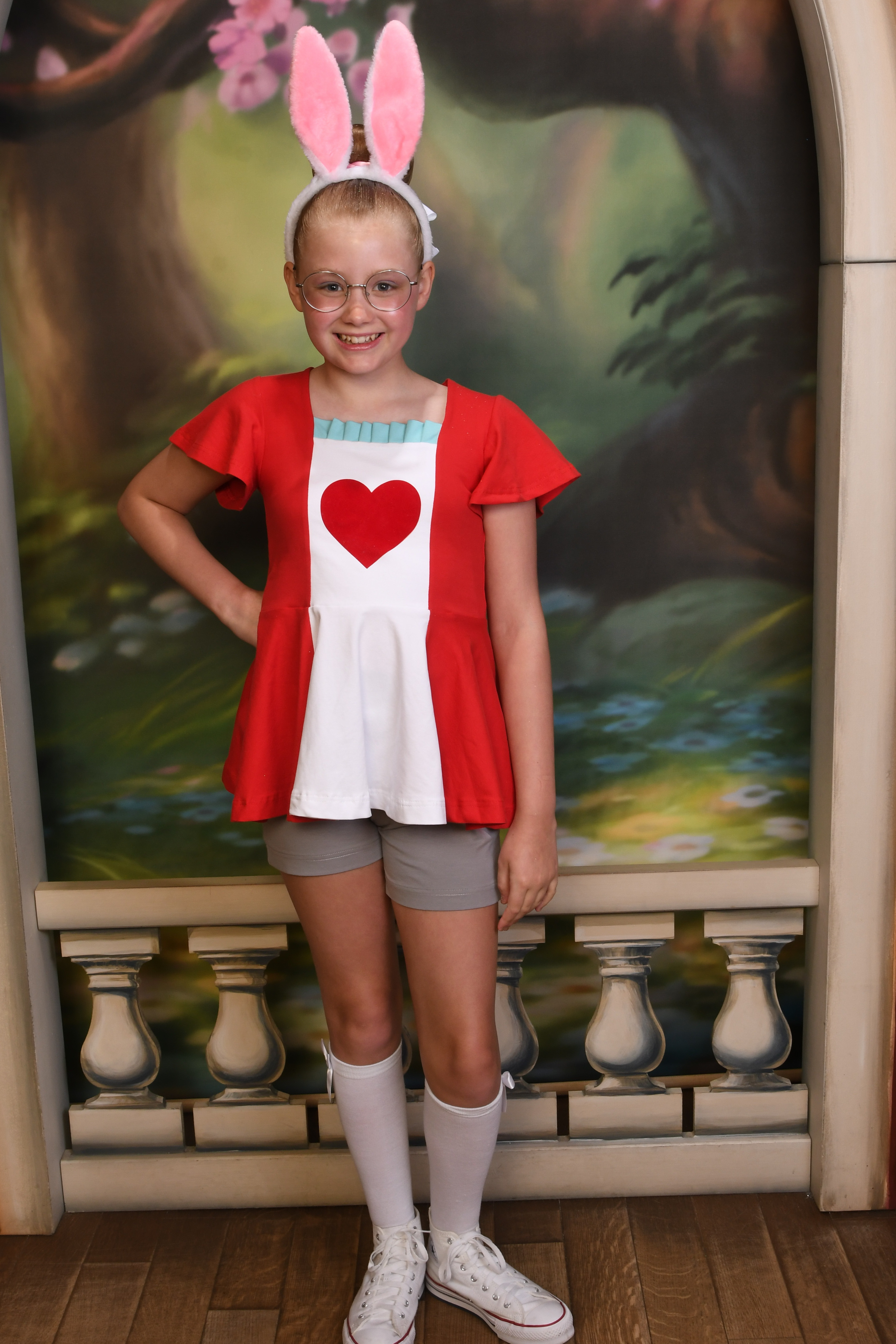 After stating categorically that this was going to be a budget trip and that there would be no extras, I decided I couldn’t miss out the chance to see our lovely Fairy Godmothers at the Bibbidi Bobbidi Boutique, and today was the day of their appointment. We had planned on a Cheshire Cat outfit for Winnie the year Covid hit, so had all the fabric stashed away. Polly was originally going to be the Mad Hatter, but as I’d already made her that outfit once when she was little, she decided on the White Rabbit instead. I never assume the girls will want to dress up, and always leave it to them to let me know if they’d like something making, but they loved designing these themselves so I knew they’d be a winner.