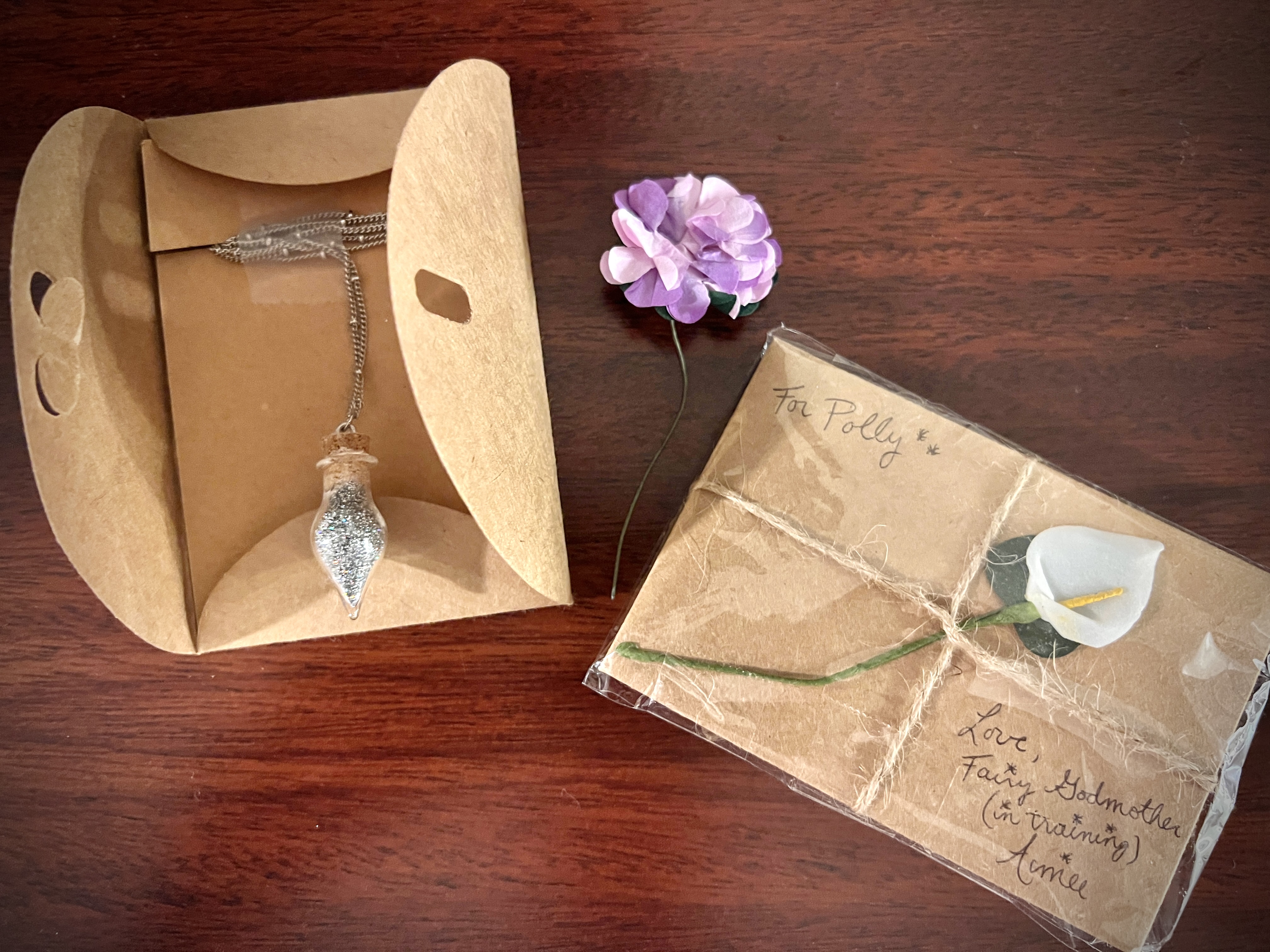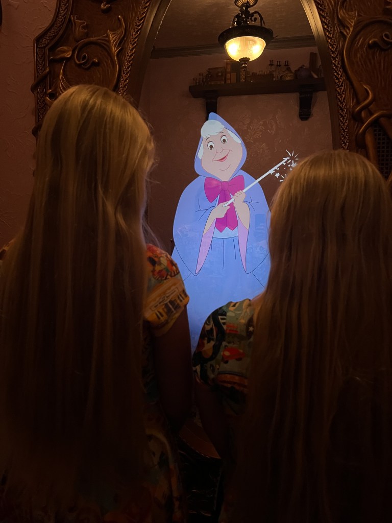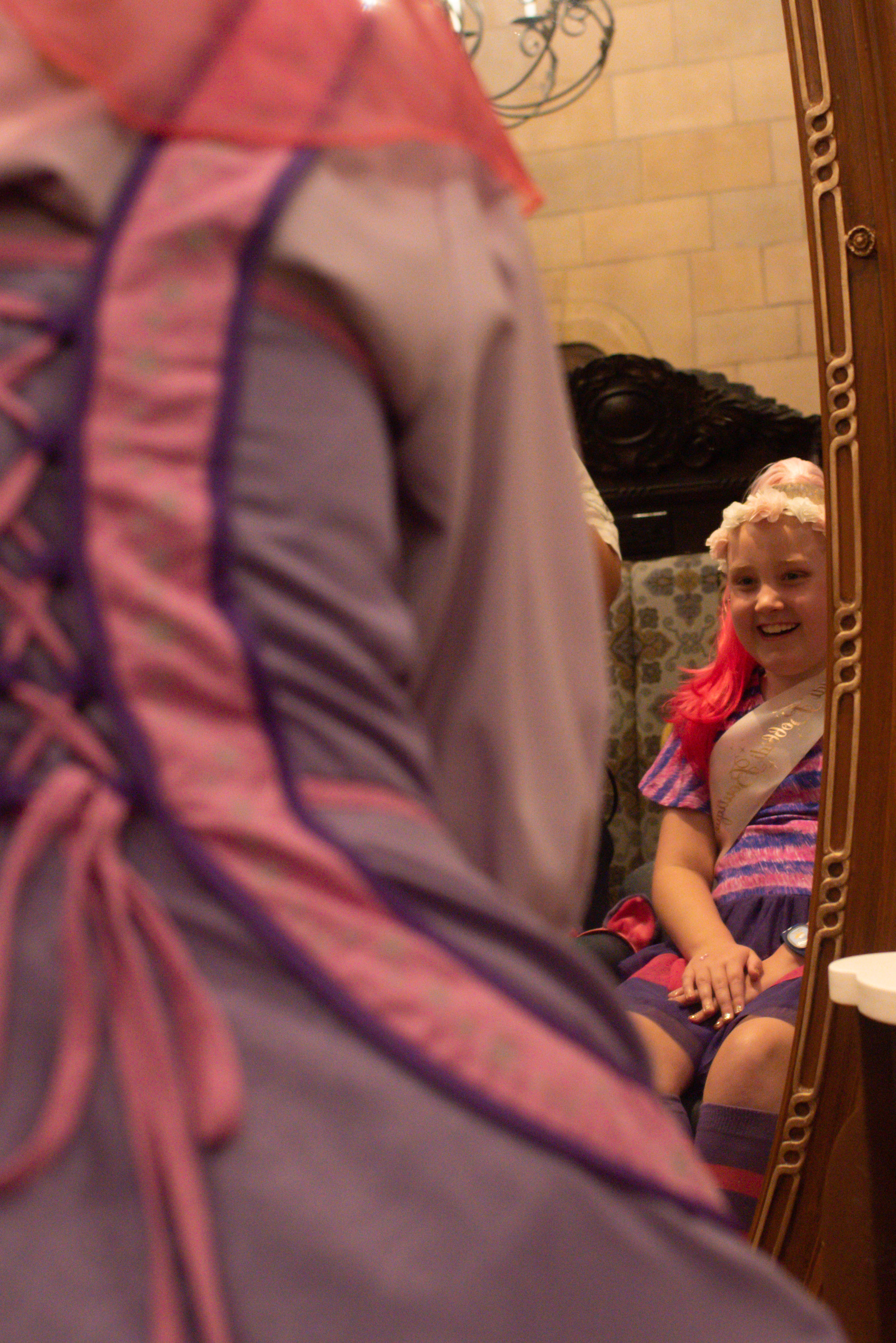 I knew that Polly’s fairy godmother, the lovely Aimee, was going to be looking after her but I kept it a surprise, so when the girls walked in to check in and saw her, they were so excited. We waited to be called through and then their outfits were laid out in the changing room for them to change into after watching the special magic mirror message.