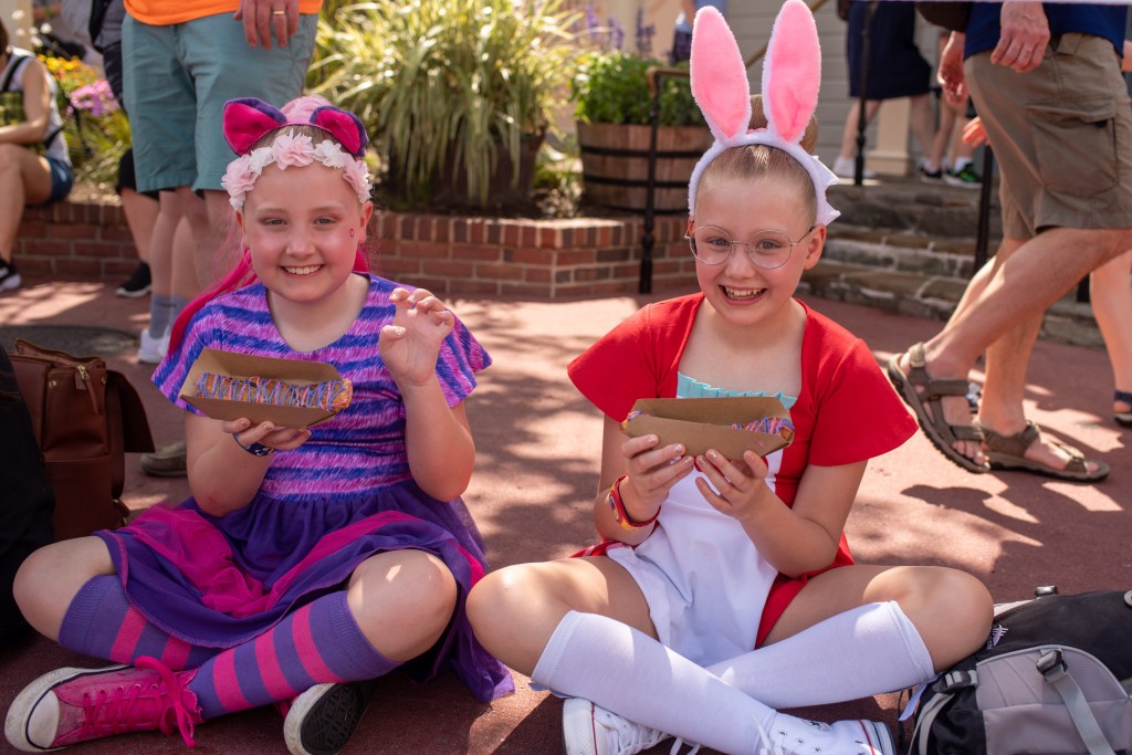 We really didn’t want to be on Main Street as it was so busy today, so we headed towards Frontierland and found one of the few shaded areas there (you can usually get a front row spot there very close to parade time, but for a shaded spot we aim for 30 minutes before the parade). Steve fetched the girls a Cheshire Cat Tail while they were waiting which they demolished!