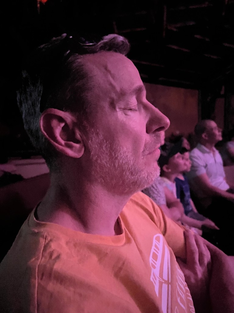 As we’d missed our Tron time (they told us earlier they wouldn’t let us ride late even with an appointment at the boutique) we cancelled it and tried for another virtual spot at 1pm, which was while we were on the boat. We got a spot, but it was a late one, and we knew we wouldn’t be in the park by then so immediately cancelled.We decided to try Kona Cafe for lunch and joined the walk-up queue as we got off the boat. We were called straight away and had a lovely meal. The food was really good and different to a lot of the food on offer in the parks. We even managed to squeeze in O’hana pudding!Suitably full we got on the monorail and headed back to try meet the bunnies again, but as we got there, they’d just closed the queue for 45 minutes, so we decided to stay in the area to avoid getting trapped by the 3pm parade and went to the Tiki Room. Steve managed another quick nap, and we all cooled down for a bit.