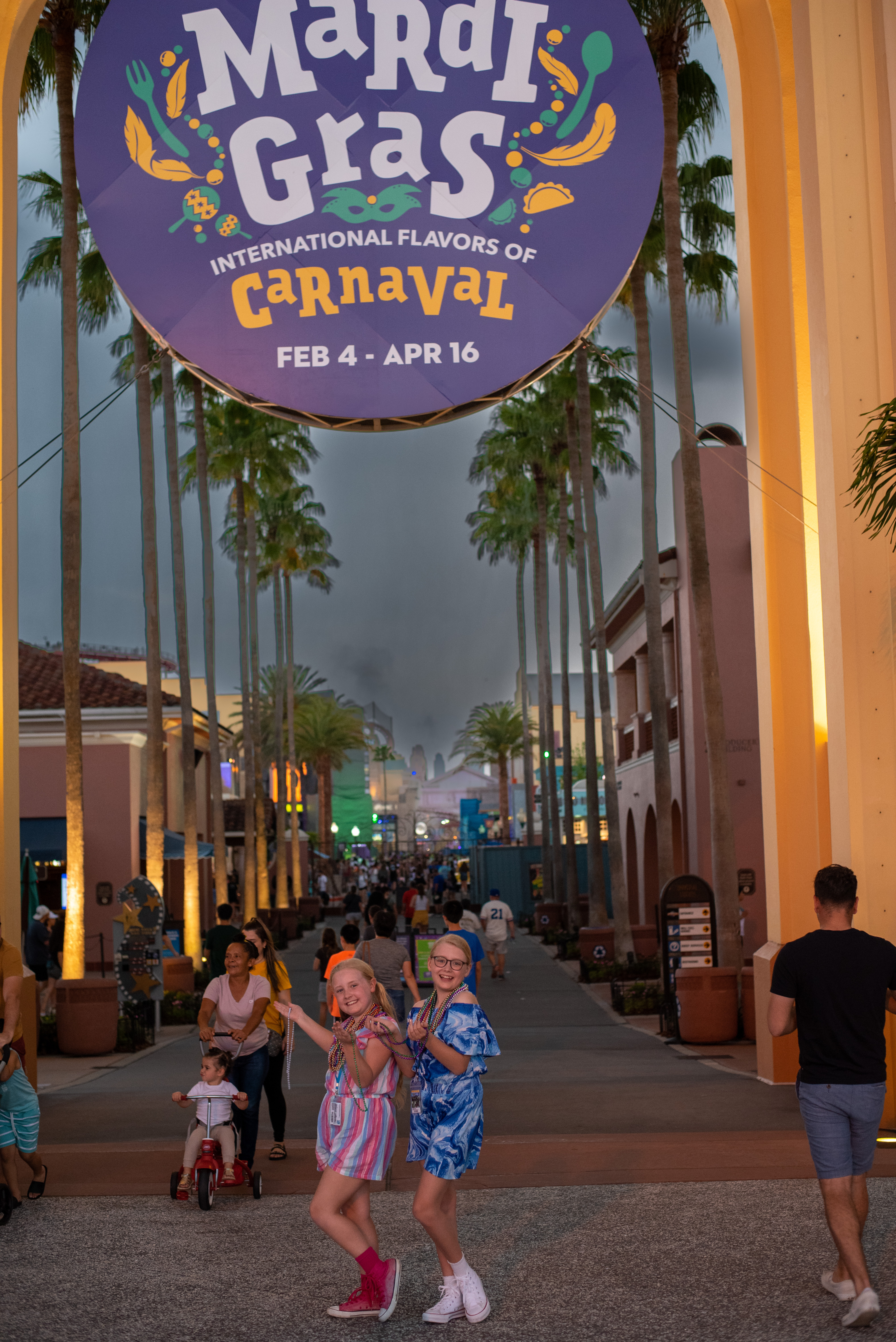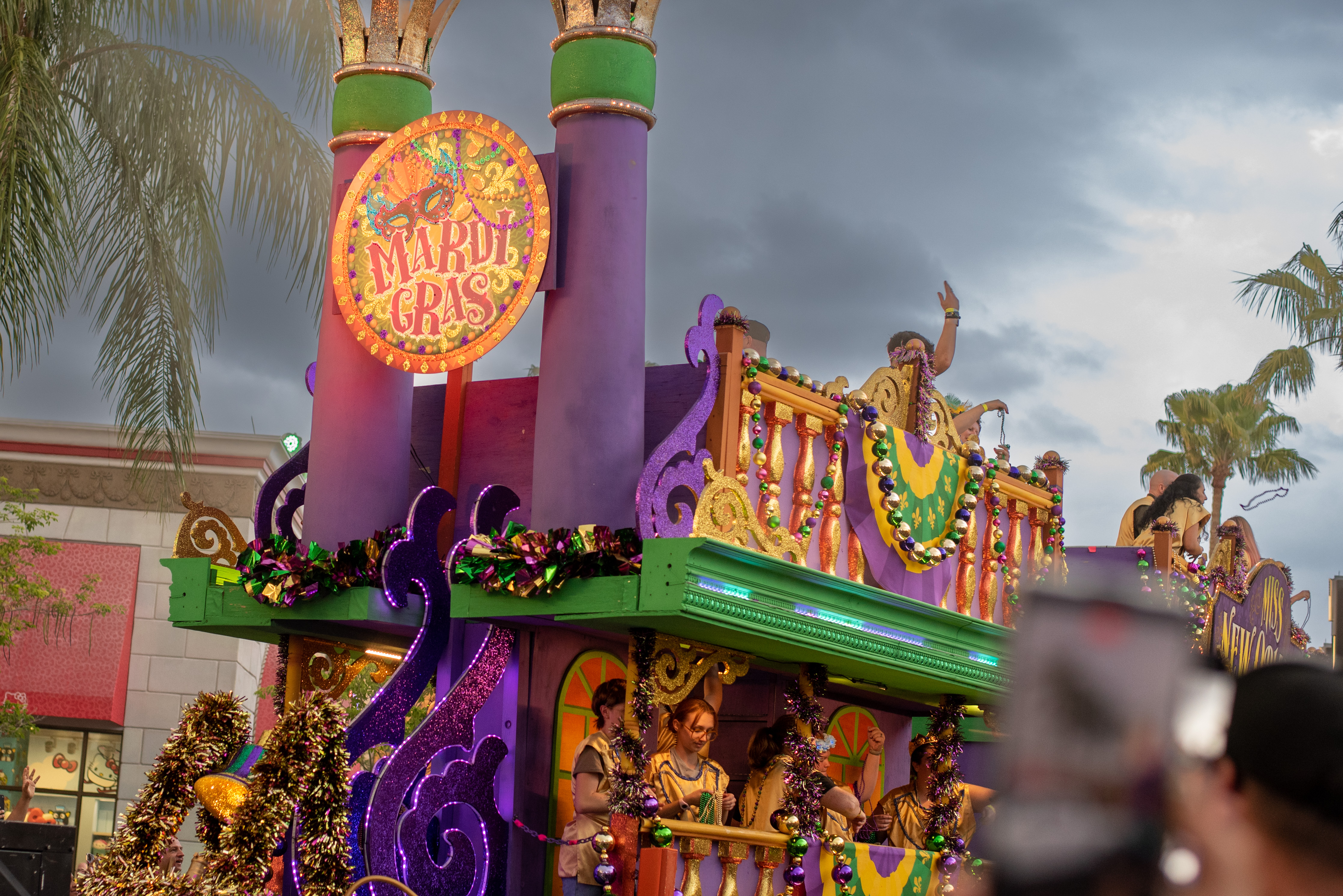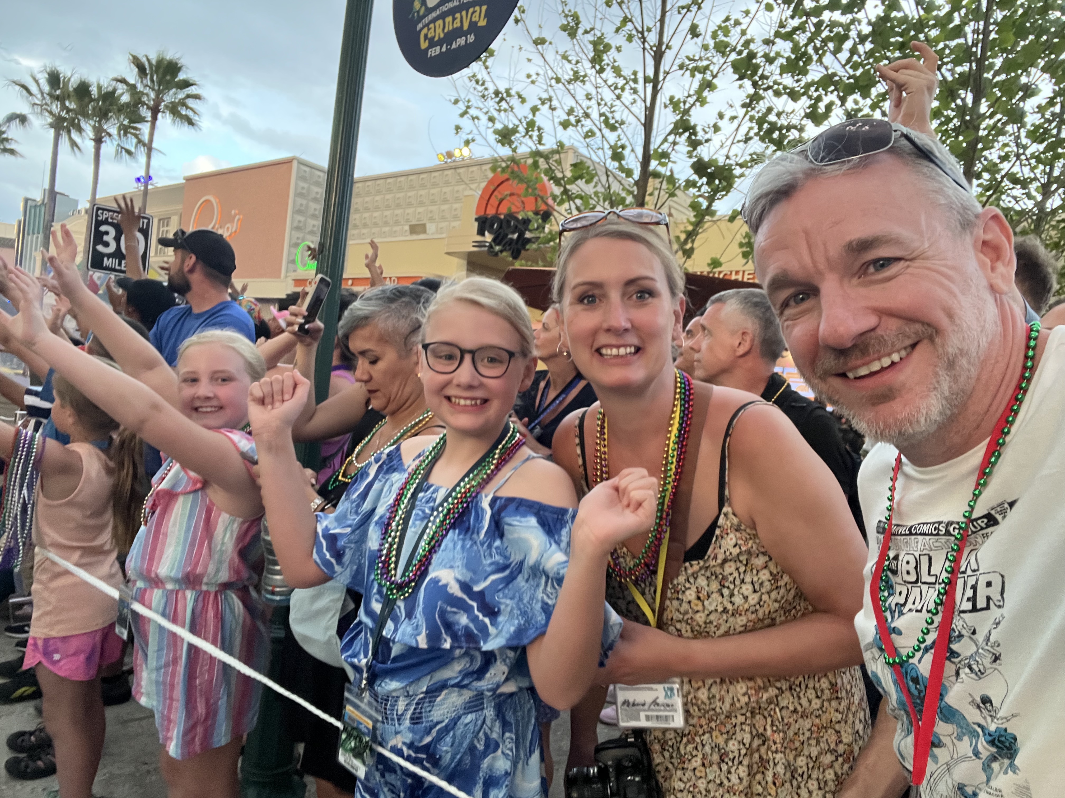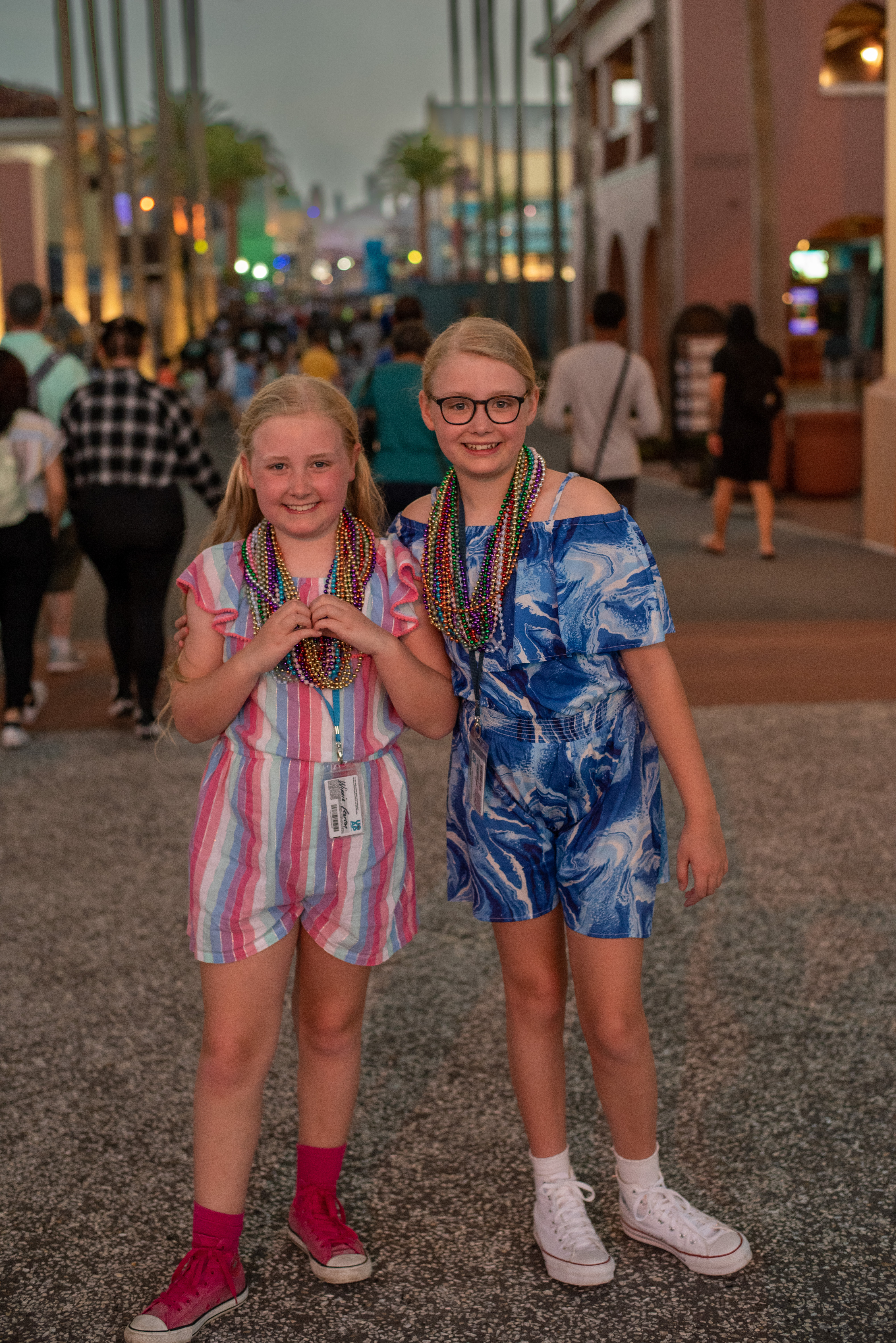 The Mardi Gras parade was at 7.30 and we got into the park around 6.45 (after a quick stop at Islands of Adventure for the girls to buy a toy they’d seen) and decided to grab a drink and just sit on the kerb and wait for it to start. We opted to stay on the exit side of the street at the start of the route so we could get out quickly afterwards. We mobile ordered Voodoo doughnuts for the girls which Steve went out to get, and by the time they’d finished them the parade was starting (they started it 10 minutes early to avoid the incoming weather which was great for us). It’s a really fun parade with lots of dancers and floats where beads are thrown out to you. The girls collected so many (I was rubbish at catching them and just ended up getting repeatedly hit in the face!!) It was so much fun, and we were all really glad we got to see it.